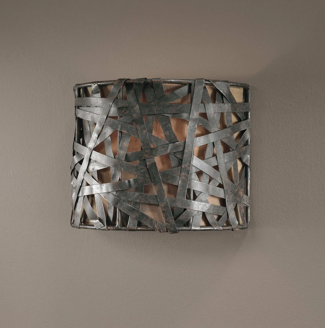 Straps Of Metal Finished In A Rust Black With Aged Silver Undertones And A Silken Bronze Fabric Liner. With 1-60 Watt Max, Candelabra Socket.