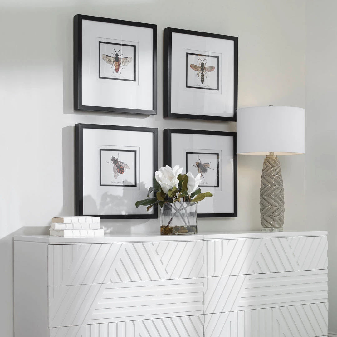Inspired By Antique Scientific Bee Studies, This Artwork Exhibits Four Unique Species In Shades Of Black, Yellow, And Orange. Each Print Is Accented By Classic White Matting With A Slim Black Fillet And Matching Frame, All Under Glass.