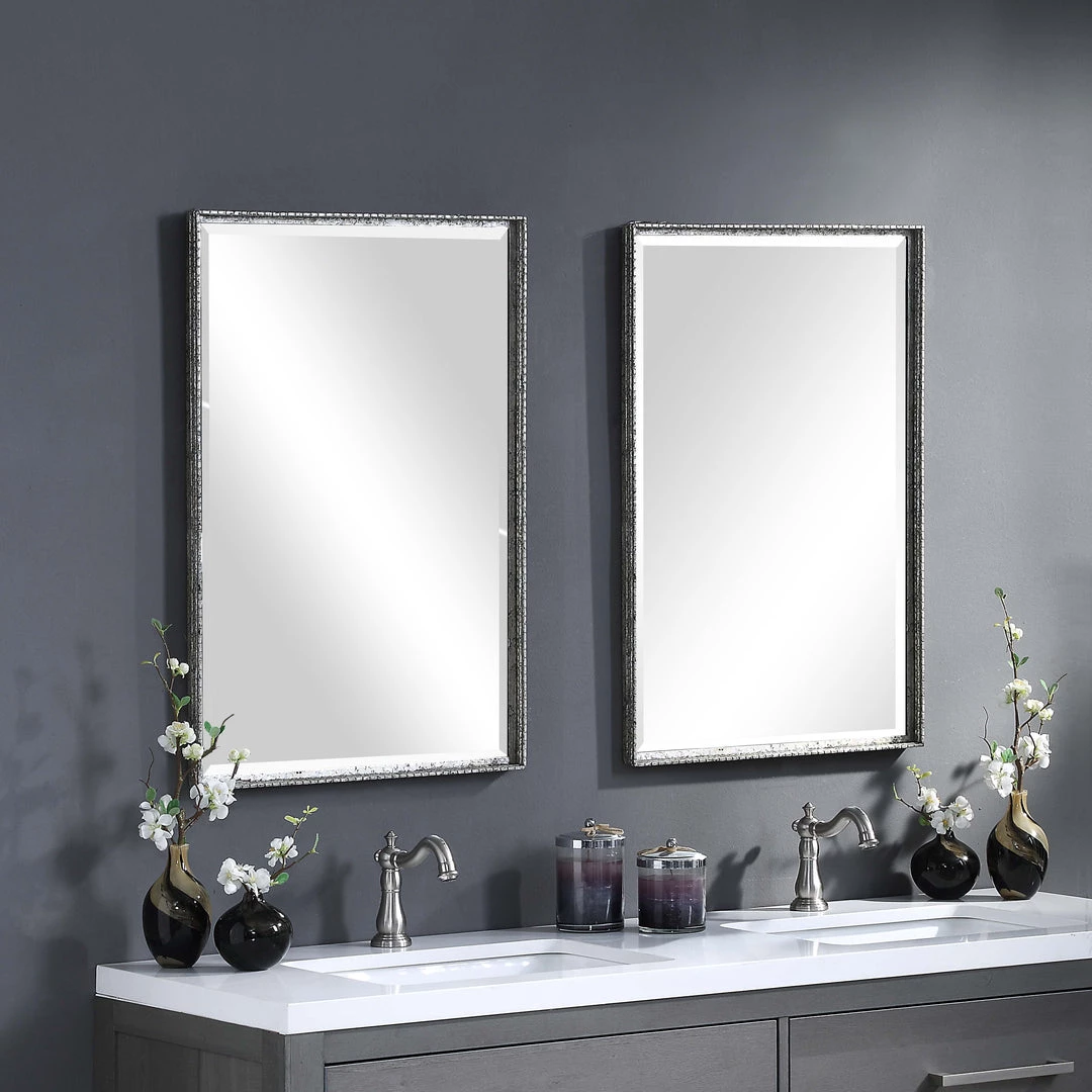 This Simple Vanity Mirror Features An Iron Construction With Detailed Edges. The Slight Profile Frame Is Finished In A Distressed Aged Silver. This Mirror May Be Hung Horizontal Or Vertical.