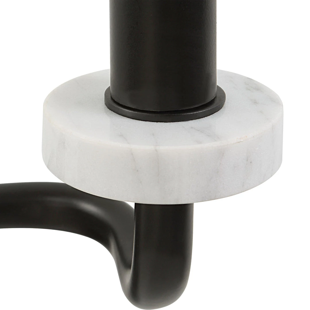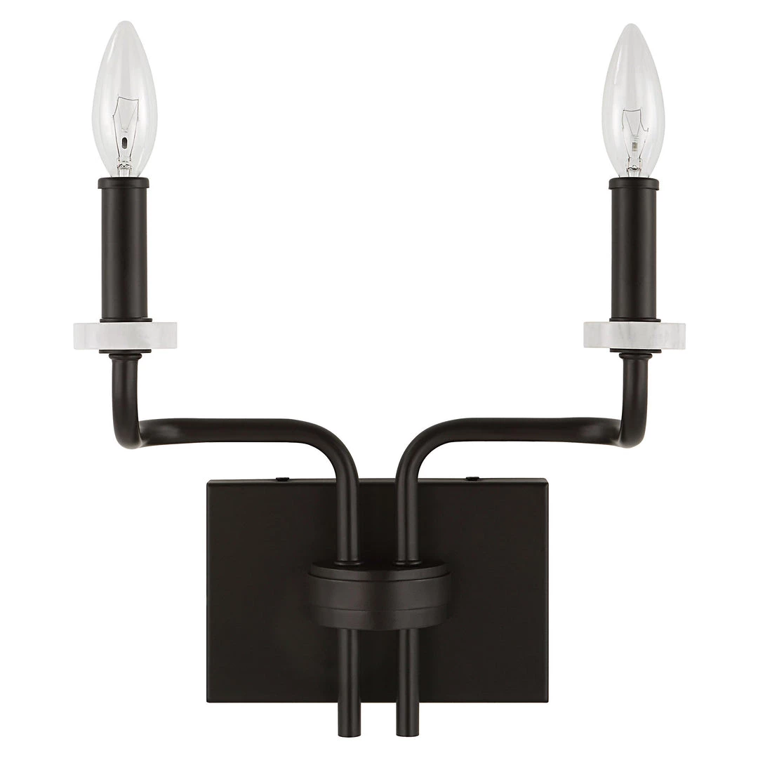 Modern & Sleek Softly Bent Lines Give This 2 Lt. Sconce A Dramatic Feel, Finished In A Deep Matte Black With Chic White Marble Disc Bobeches. With 2-60 Watt Max, Candelabra Sockets.