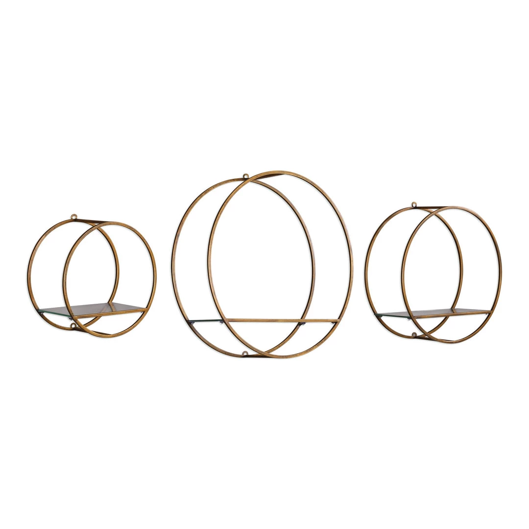 A Trio Of Simplistic 3-dimensional Drum Cage Shelves Featuring Hand Forged Iron In Antique Bronze With Floating Tempered Glass Shelves. Sizes: Sm-12x13x7, Med-16x17x7, Lg-20x21x7