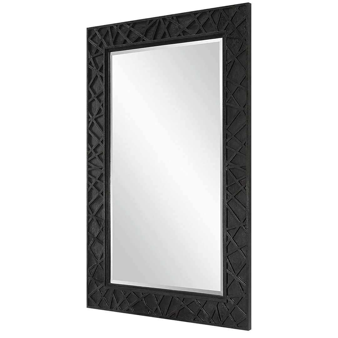 Sure To Make A Statement In Any Space, This Oversized Mirror Sports A Wood Frame With Raised Geometric Details, Finished In A Satin Black. Mirror Has A Generous 1 1/4″ Bevel And May Be Hung Horizontal Or Vertical.