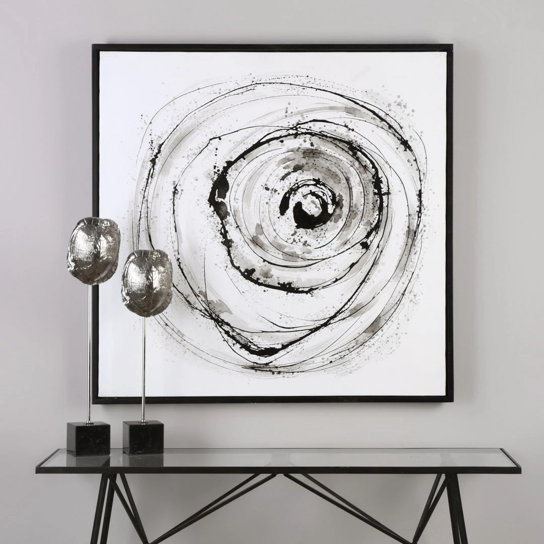 This Hand Painted Abstract On Canvas Showcases A Bold Design With A Subdued Palette. The Monochromatic Color Scheme Adds A Modern Edge To This Design. The Canvas Is Stretched And Attached To Wooden Stretching Bars. A Petite, Black Satin Frame Completes Each Piece. Due To The Handcrafted Nature Of This Artwork, Each Piece May Have Subtle Differences. This Piece May Be Hung Horizontal Or Vertical.