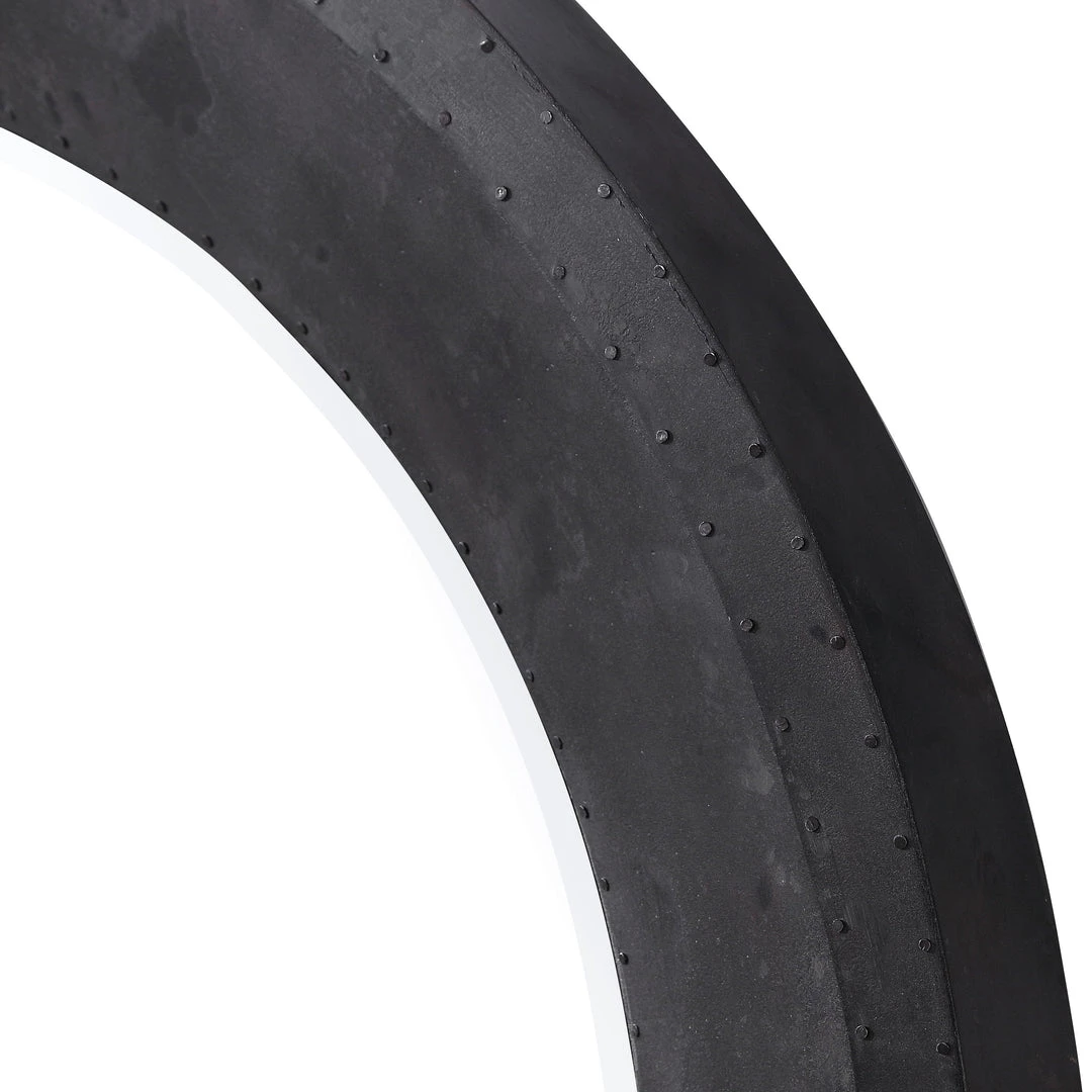 Showcasing An Industrial Style, This Round Mirror Is Paired With An Oxidized Metal Frame In Dark Gray, Silver, Charcoal, And Rust Tones With Nail Accents. A Generous 1 1/4″ Bevel Completes This Piece.