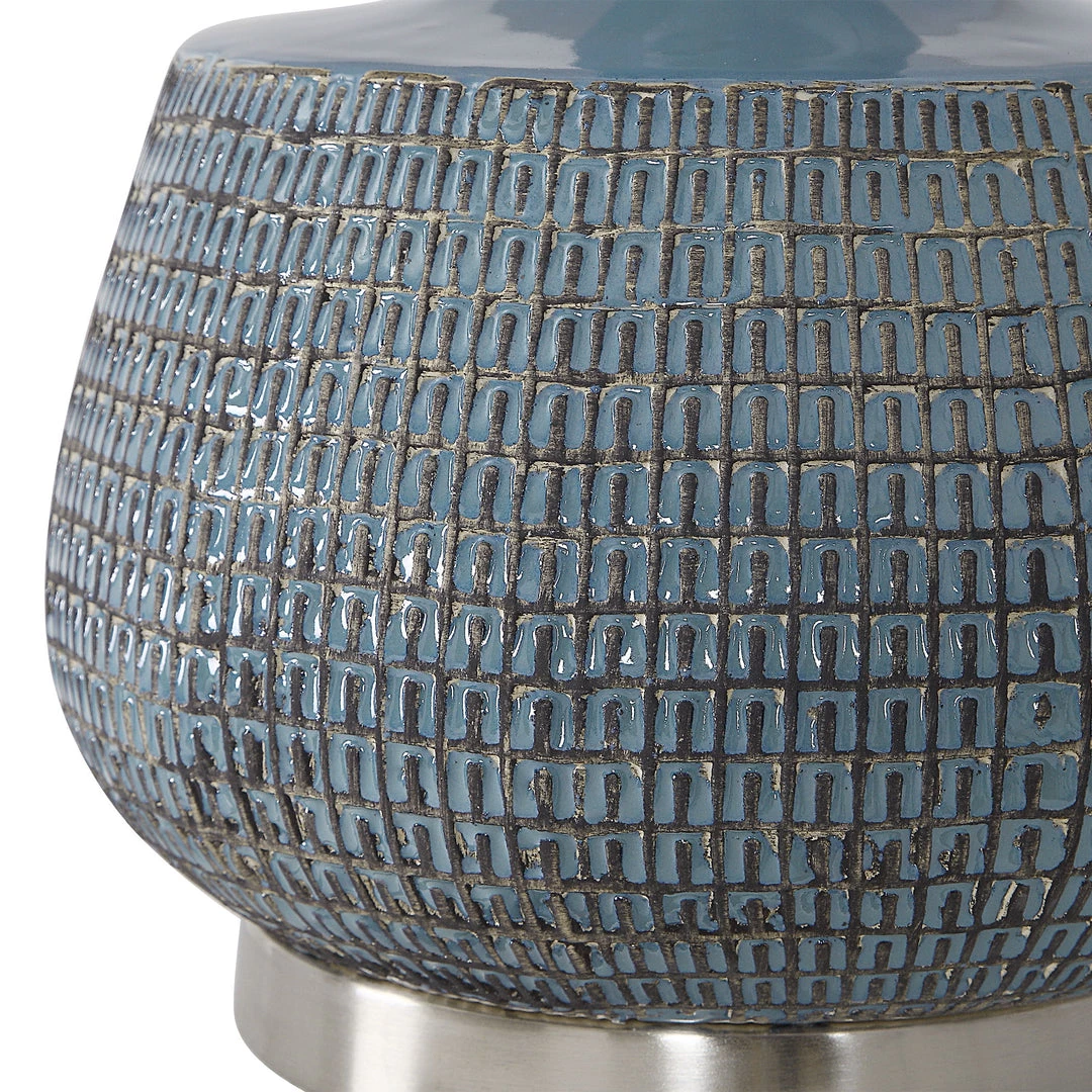 Add A Touch Of Tribal Flair To Any Room With This Embossed Ceramic Table Lamp That’s Finished In A Blue Glaze With Rust Bronze Distressing That Highlight The Decorative Detailing, Paired With Brushed Nickel Plated Accents. The Round Hardback Drum Shade Is A Light Beige Linen Fabric With Natural Slubbing.