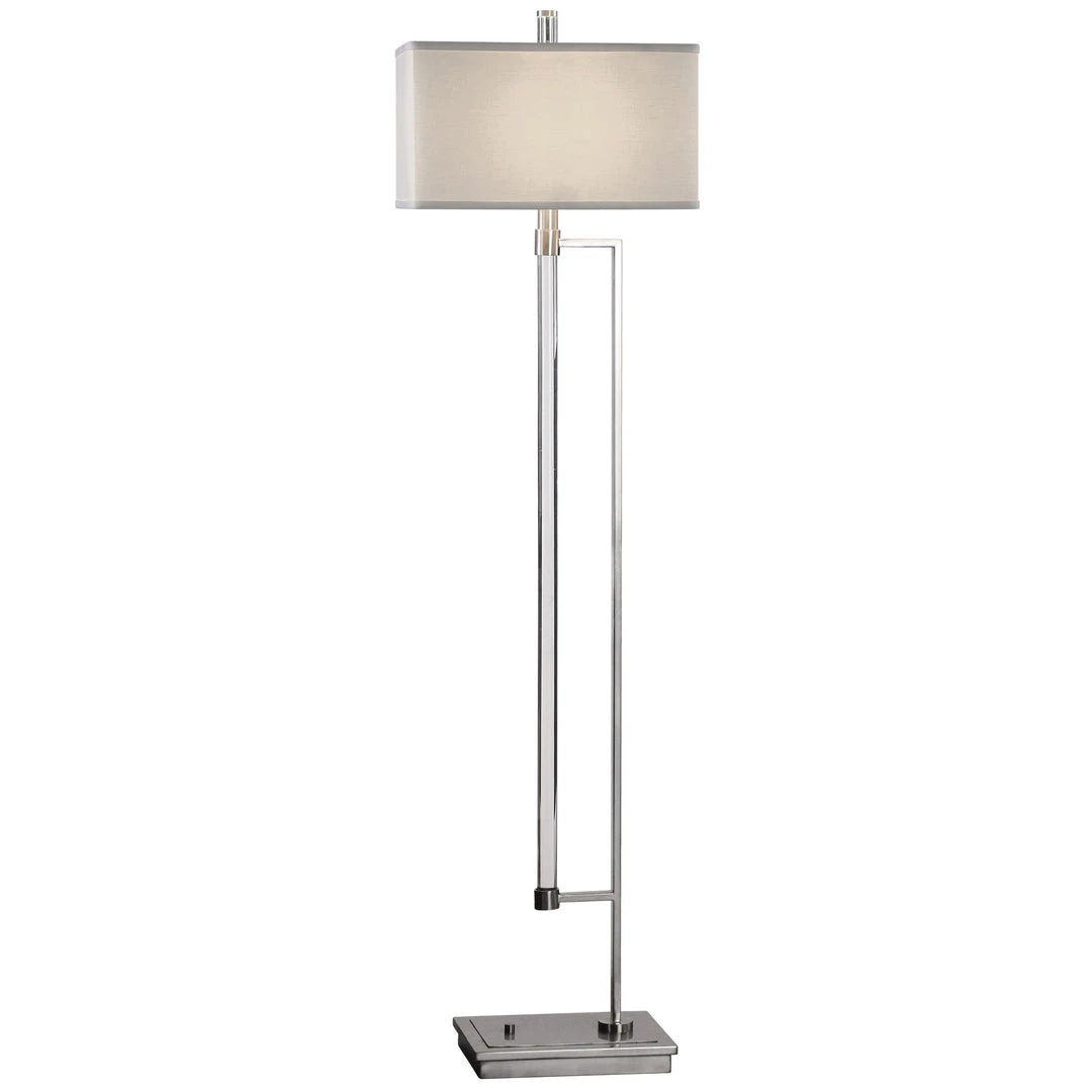 Thick, Clear Acrylic Rod Supported By Forged Iron Finished In Plated Polished Nickel. The Rectangle Hardback Shade Is A White Linen Fabric With Light Slubbing.