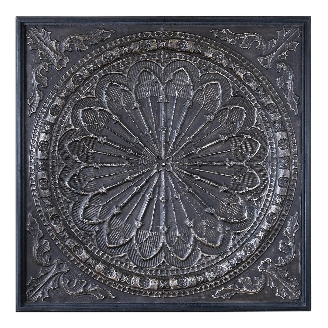 Ornate Wall Decor Made Of Embossed Iron Finished With A Lightly Antiqued, Chocolate Brown Glaze Accented By A Narrow, Black Crackled Frame.