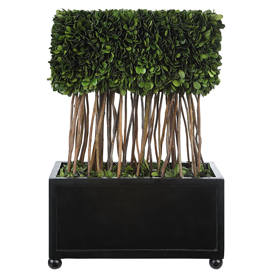 Natural Evergreen Foliage Preserved While Freshly Picked, Looks And Feels Like Living Boxwood. Supported By Natural Willow Branches, The Rectangular Topiary Is Potted In A Contemporary Ball Footed Planter Finished In Satin Black. For Indoor Use Only.