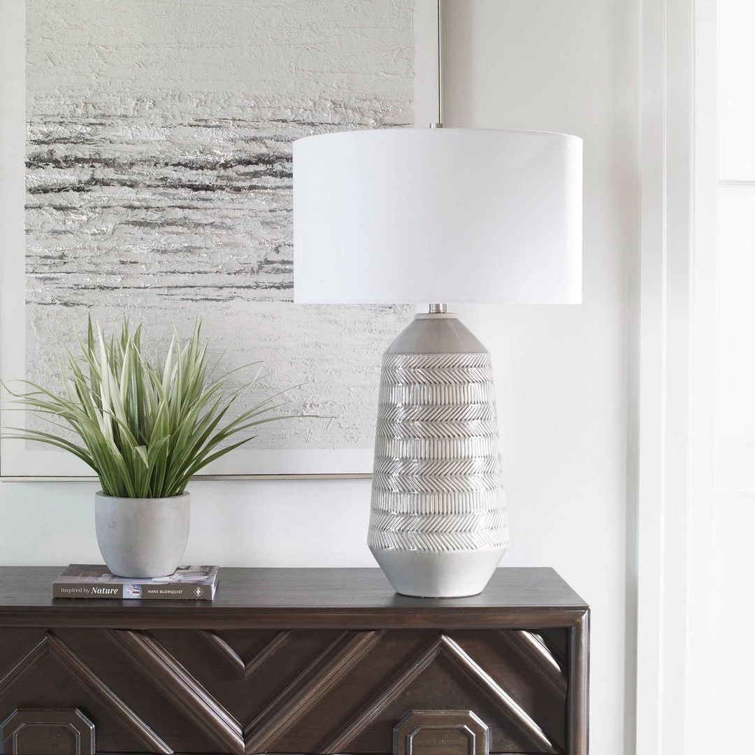 Showcasing A Classic Carved Herringbone Pattern, This Ceramic Table Lamp Is Finished In A Versatile Soft Gray Glaze With Brushed Nickel Accents. A White Fabric Drum Shade Completes The Look.