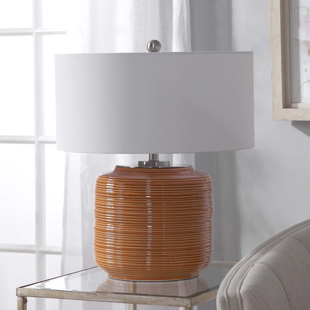 Add A Touch Of Retro Flair To A Design With This Ceramic Table Lamp. The Ribbed Base Is Finished In A Bright Orange Hue And Is Accented By Brushed Nickel Hardware. The Lamp Is Paired With A White Linen Drum Shade.