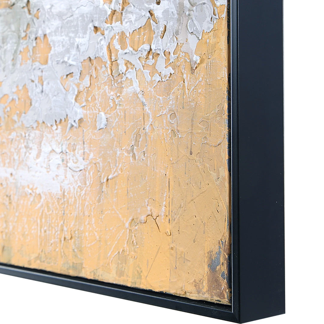 A Bold Design And Subdued Palette Make Up This Hand Painted Abstract On Canvas. Textured Brown, Ochre, Gray, And White Shades Are Accented By Gold Leaf Details And Pops Of Emerald Green On This Modern Artwork. A Wooden Gallery Frame Surrounds This Piece. Due To The Handcrafted Nature Of This Artwork, Each Piece May Have Subtle Differences.
