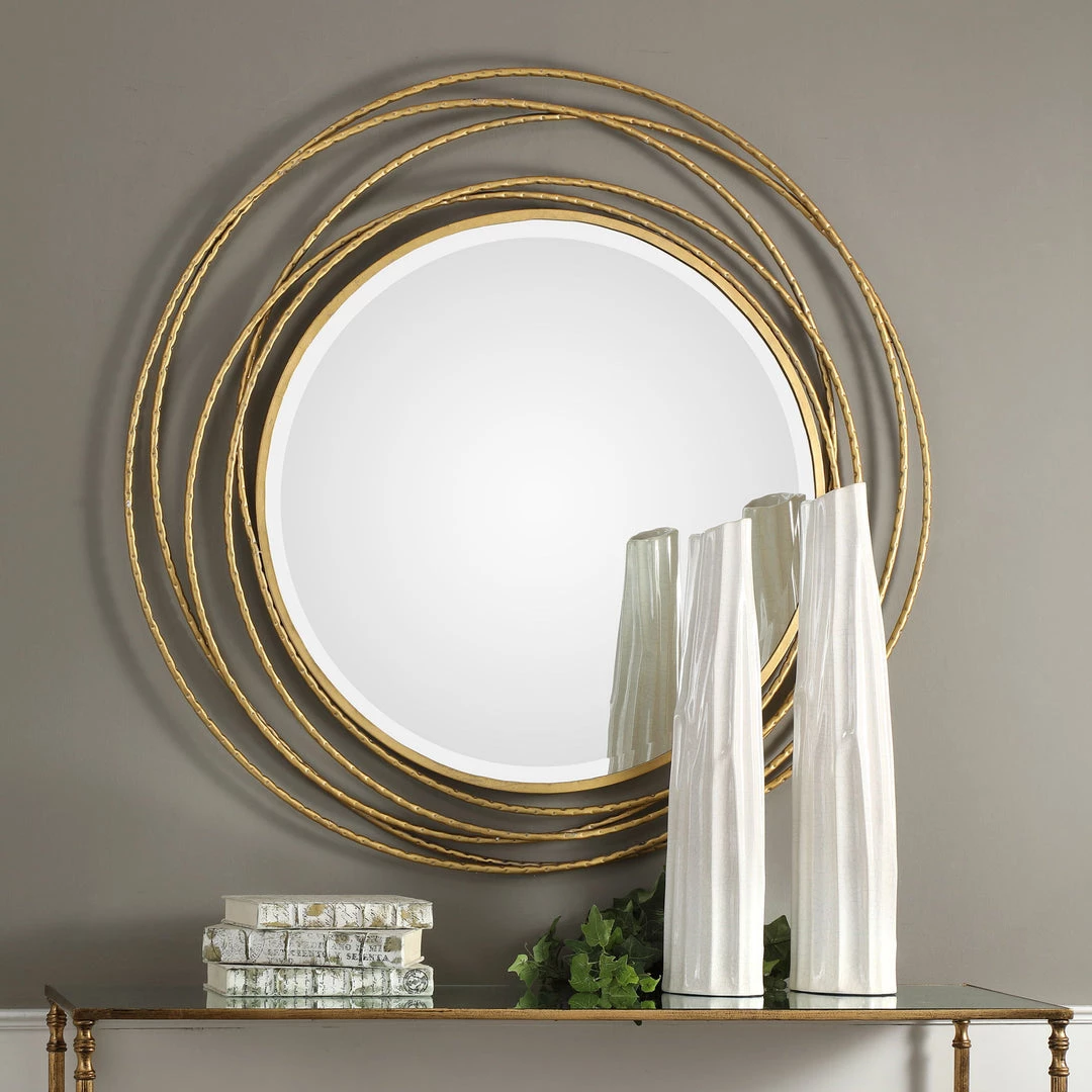 Hand Forged Iron Coils, Finished In A Metallic Gold Leaf, Accented With A Subtle Hammered Texture. Mirror Features A Generous 1 1/4″ Bevel.