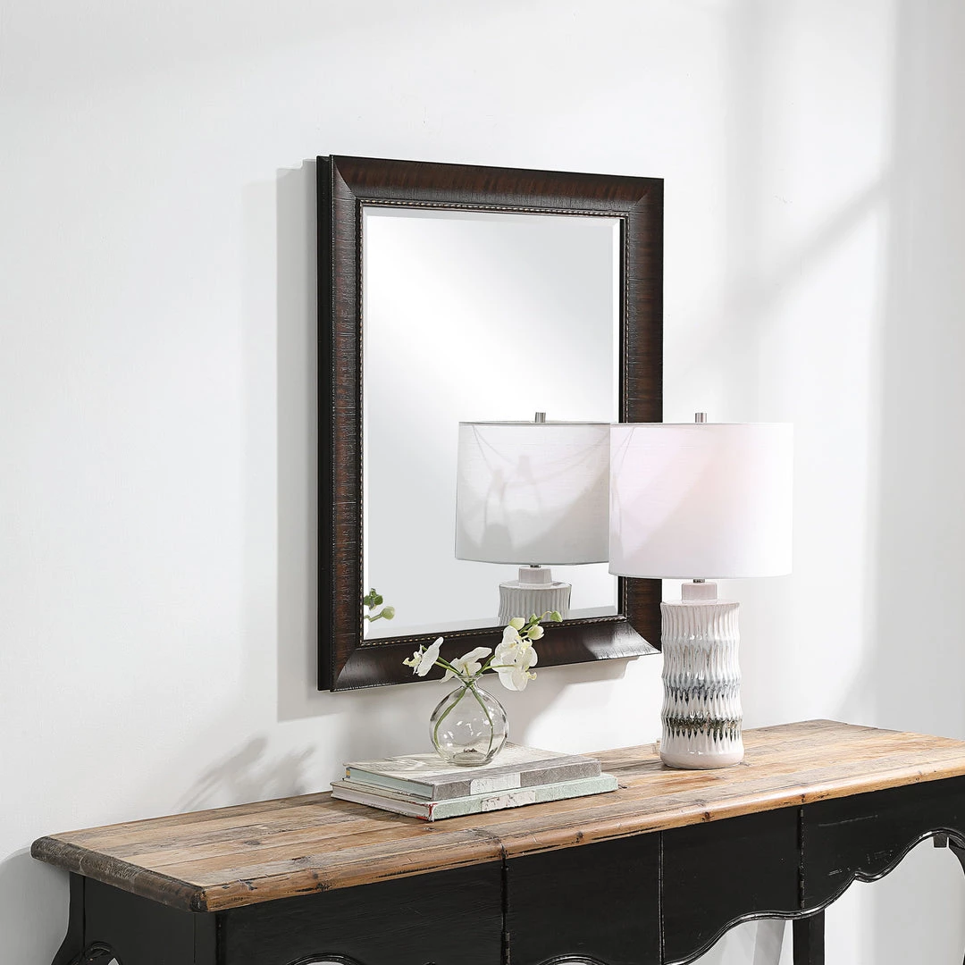 This Rectangular Mirror Features A Heavily Burnished Wood Look With Rich Mahogany Undertones, Faux Exposed Wood Grain And A Beaded Inner Liner. The Piece Has A 1″ Bevel And May Be Hung Horizontal Or Vertical.
