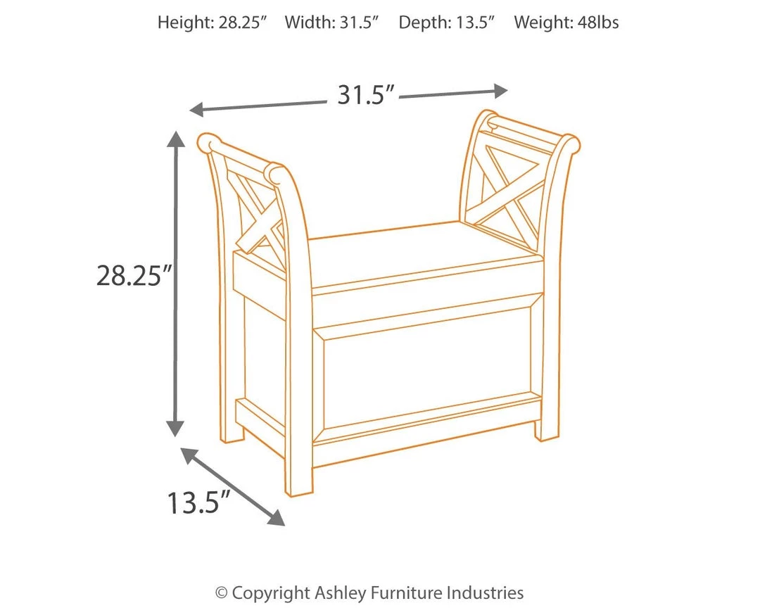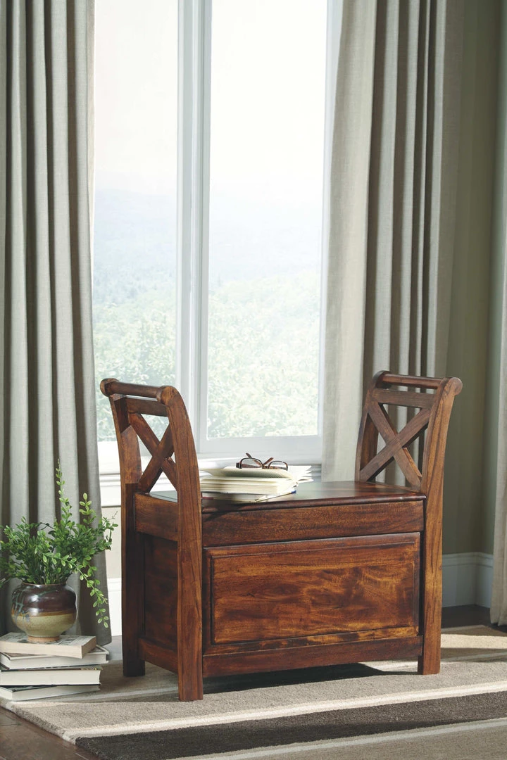 The extraordinarily rich finish of this bench is just the beginning. Quality construction with select wood gives this piece great staying power. Gently sweeping sides with classic X-braces frame a sweet place to sit a spell. Simply lift the hinged seat to reveal handy storage: perfect for keeping treasures tucked away yet close at hand.
