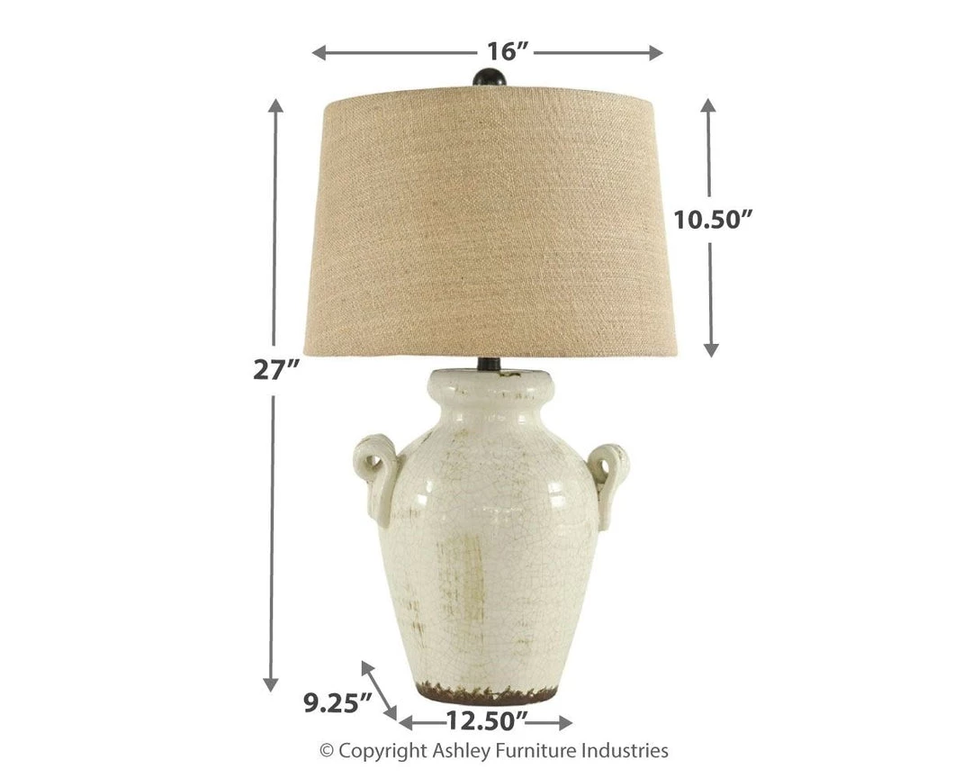This table lamp illuminates with vintage-inspired style. Antiqued cream glazed ceramic base boasts a crackle effect. Vase shape with the appearance of handles sits beautifully on end table. Perfect for farmhouse and cottage chic spaces.