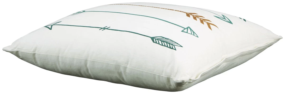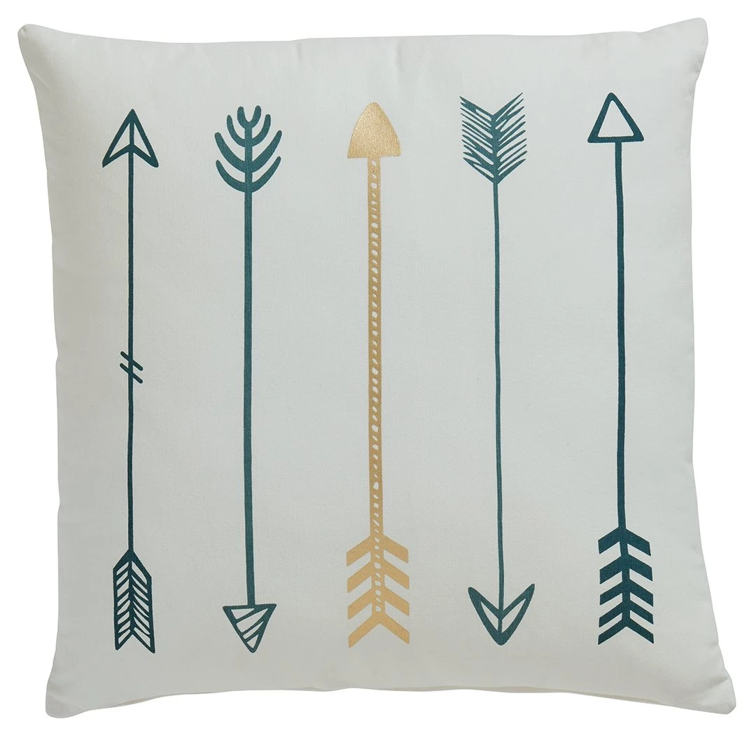 Add a distinctive piece of decor to your room with this accent pillow. Adorned with a pattern of arrows in teal, white and metallic goldtone, this striking print adds a splash of style to any decor. Featuring a cotton cover with knife edge construction and zipper closure, this pillow is perfect for use on a bed or chair to freshen up your living space in a beautiful way.