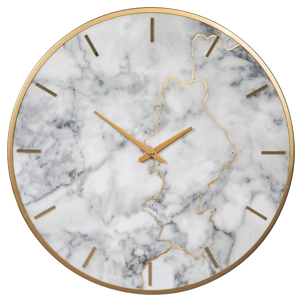 Time is captured in irresistible beauty with this wall clock. Gorgeous striations in the faux marble face are highlighted with goldtone finished metal. This contemporary mix of materials hangs artfully in your home.