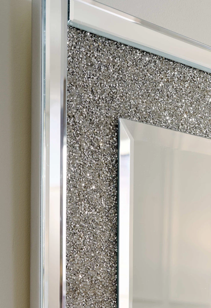 Subtle glitz and glam are in reach with this accent mirror. Beautifully crafted with a cut glass outer frame with delicate crystal beading on the inner frame. The beveled center mirror floats inside the frame adding a soft sparkle to any room.