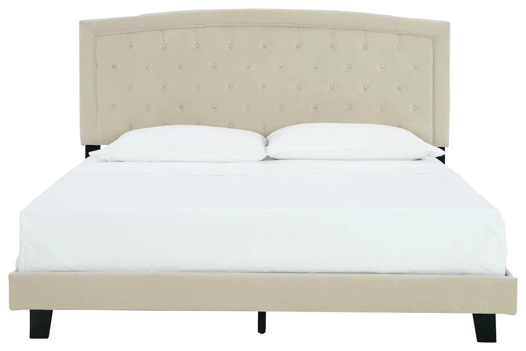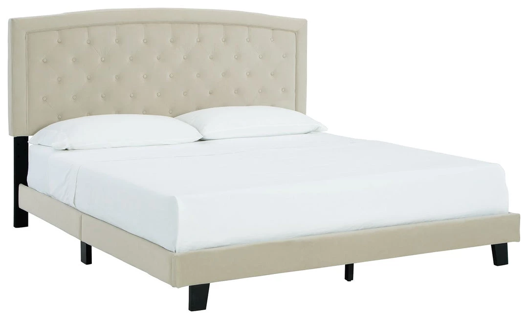 Appreciate the sleek styling and sumptuous comfort of this upholstered bed. Wrapped in a luxurious polyester weave from head to toe, and adorned with elegant button tufting and framed details, this king platform bed sets the scene in your blissful retreat. Rest assured, sturdy roll slats eliminate the need for a foundation/box spring for a well-edited aesthetic.