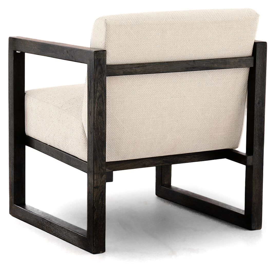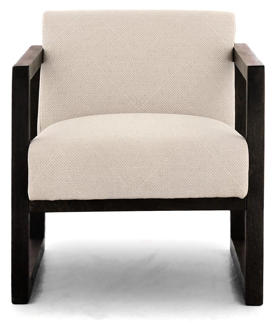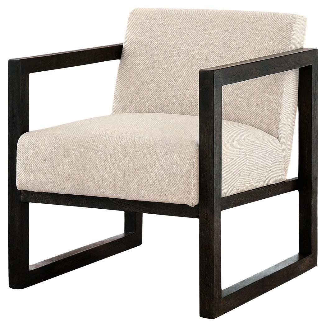 A wire brushed frame in brown finish, a slight pitched back and two-tone cream upholstery is this accent chair. Perfect on its own or pair it up.
