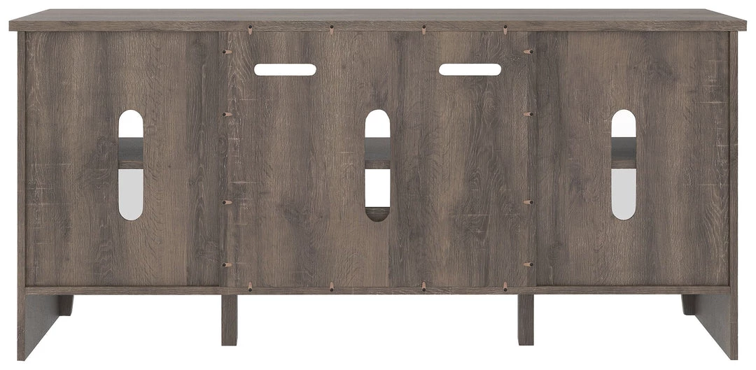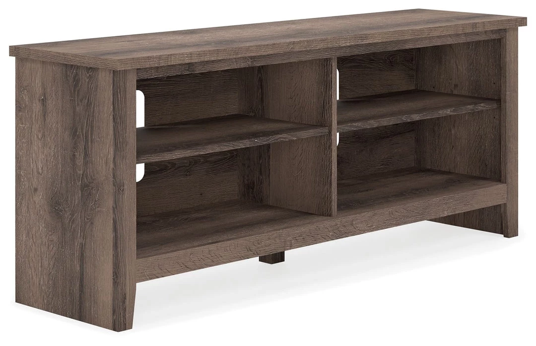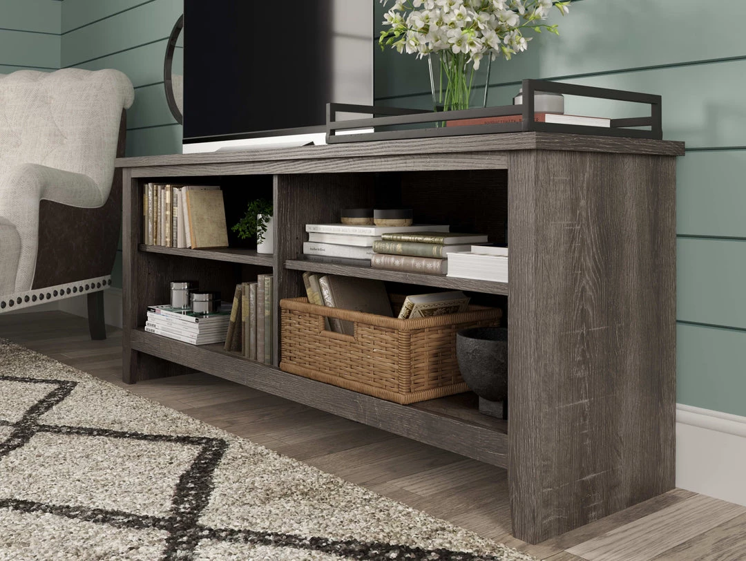 With its replicated weathered oak finish and minimalist charm, this TV stand is right in tune with your relaxed approach to high style. Beautifully made to accommodate your media equipment, it’s well equipped with a flexible, open-concept design and cutouts for wire management that enhance the clean-lined aesthetic. The look is ideal for modern farmhouse and contemporary settings.