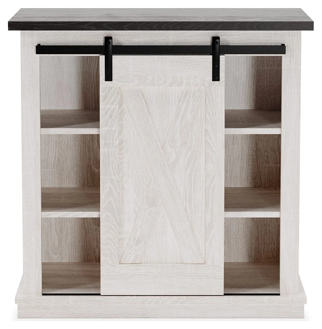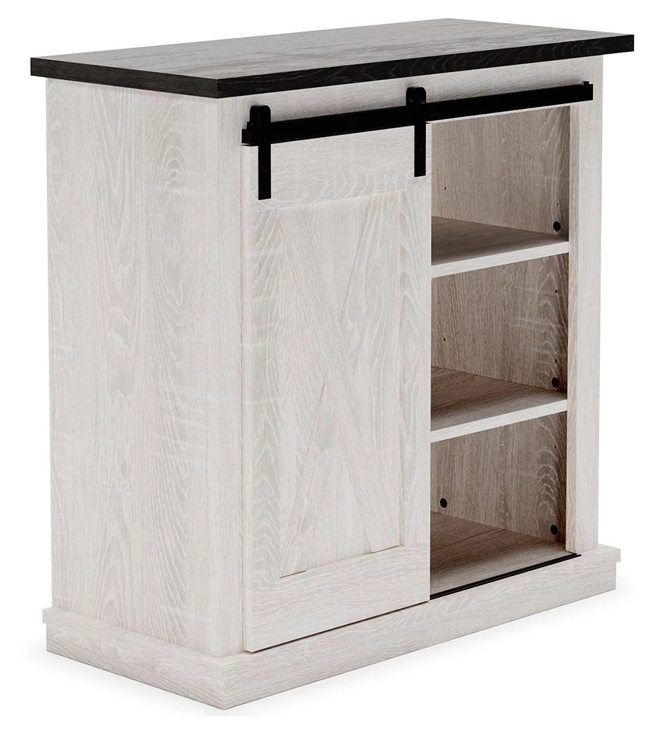 Accent cabinet. Constructed of engineered wood in antique white and gray wood grained effect laminate. Black finished hardware. Cross buck pattern door front. 1 sliding door and 4 adjustable shelves.