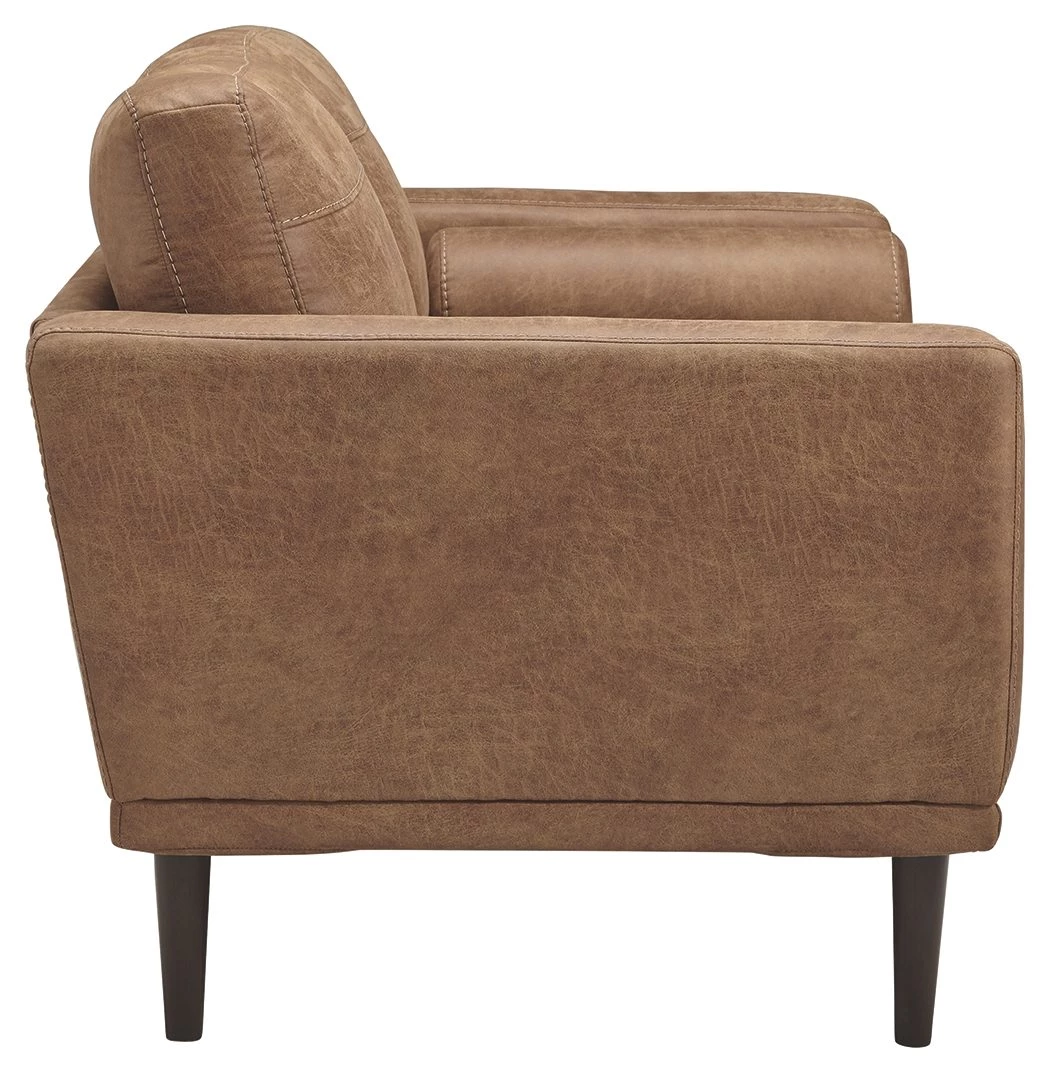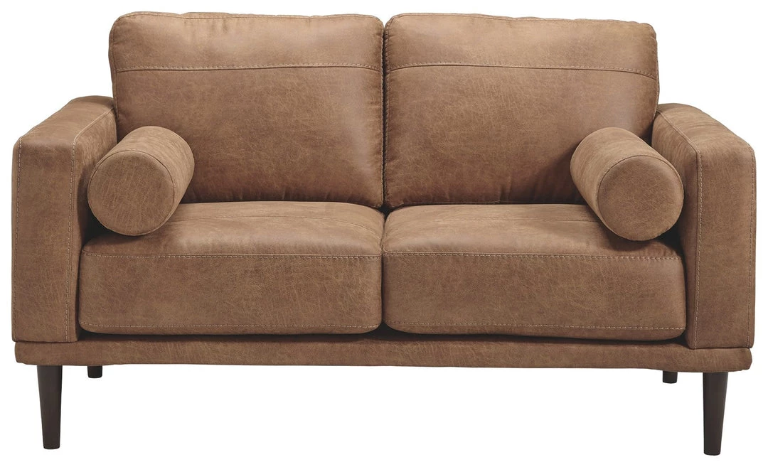 For a fresh spot in your space, turn to this designer loveseat. This invigorating piece breathes warmth into your home with its striking caramel faux leather upholstery and tapered legs. Wind down at the end of a long day when you sink into this canyon of comfort.