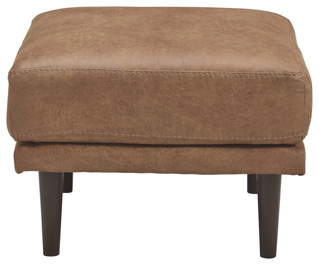 For a fresh spot in your space, turn to this designer ottoman. This invigorating piece breathes warmth into your home with its striking caramel faux leather upholstery and tapered legs. Wind down at the end of a long day with your feet propped up on this canyon of comfort.