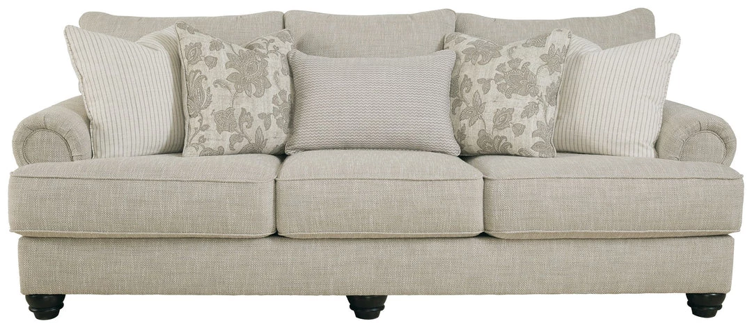 This sofa has an alluring look that’s guaranteed to turn heads. Richly textured fabric in a light, easygoing hue is enhanced by even lighter flax peeking through. Distinctive roll arms add a dab of debonair, while indulgently plush cushions cradle you softly. Sit back and relax in comfort and style, with plenty of room to stretch out and unwind at the end of a long day.