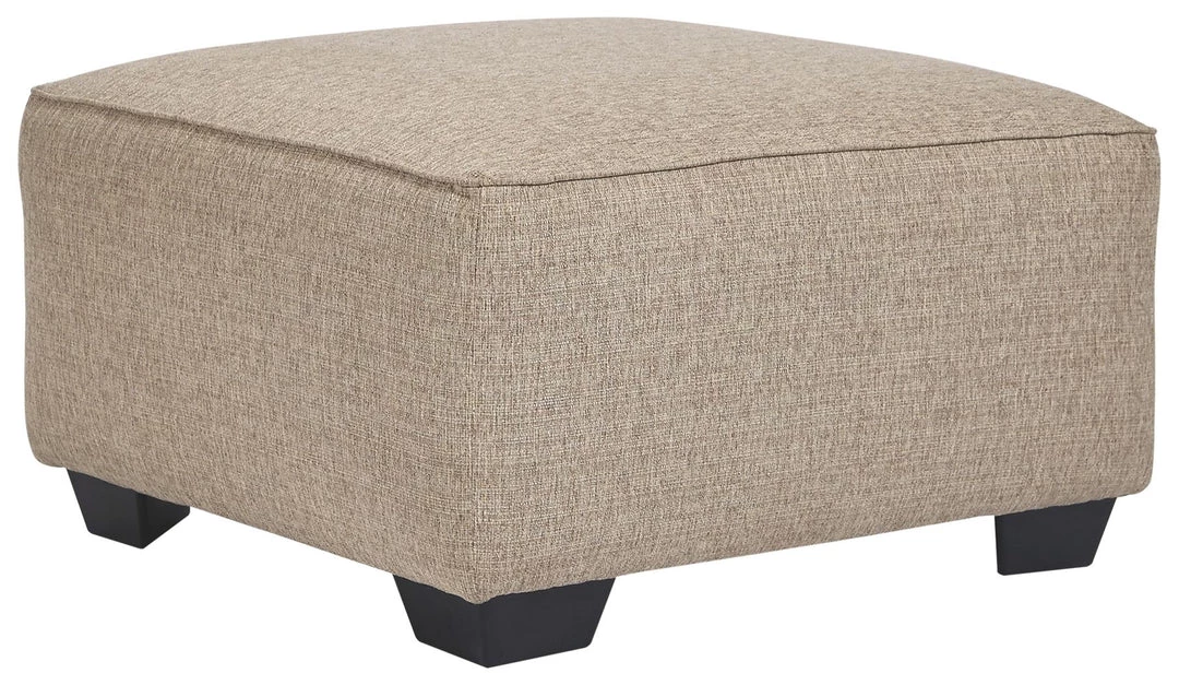 This generously scaled ottoman makes high style look effortlessly elegant. Textured linen-weave upholstery is warm, neutral and a natural complement for any space. Tri-block feet in a dark finish add a nice contrast and tailored touch.