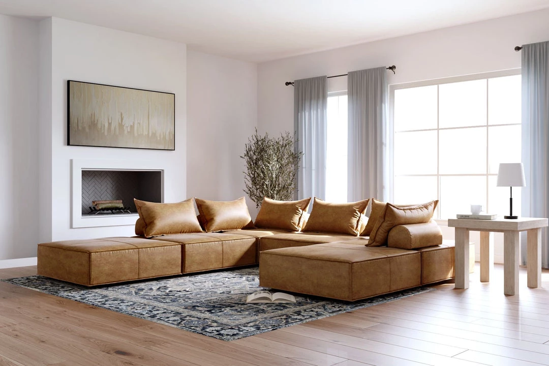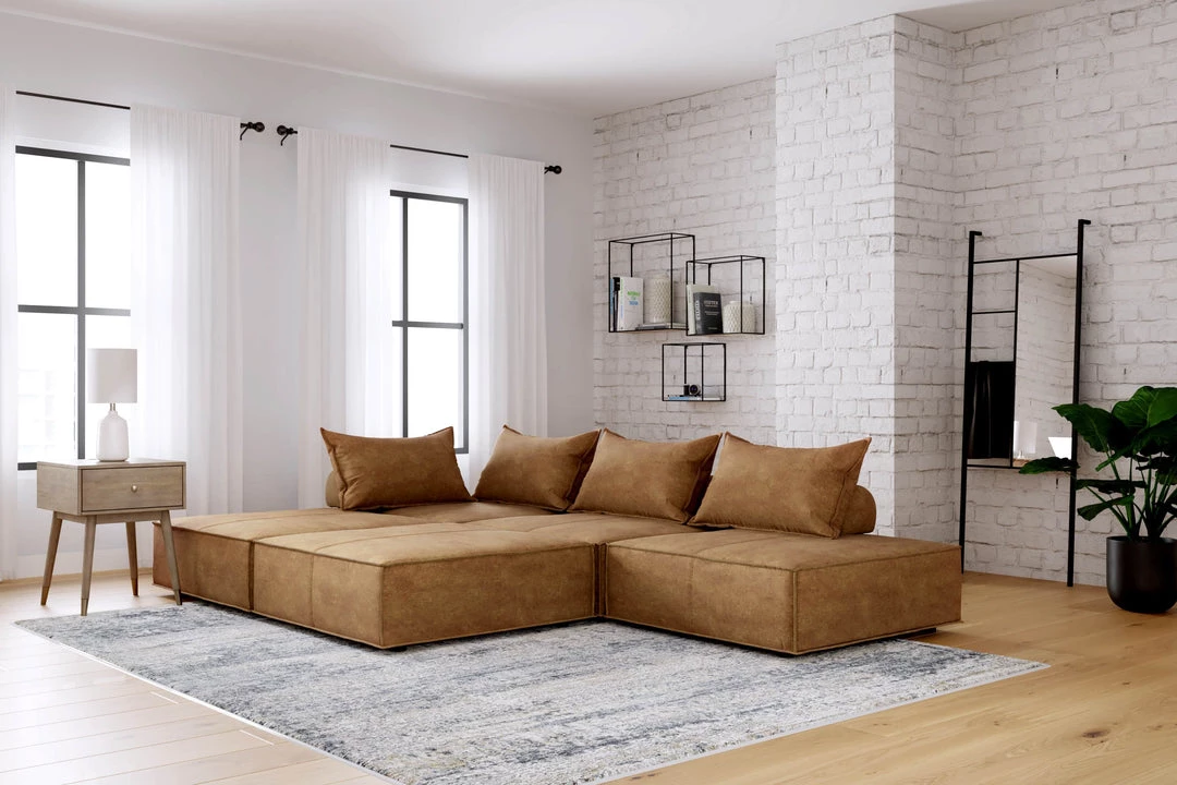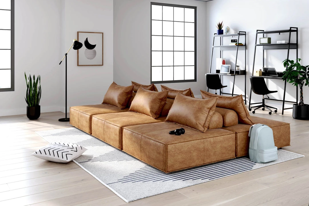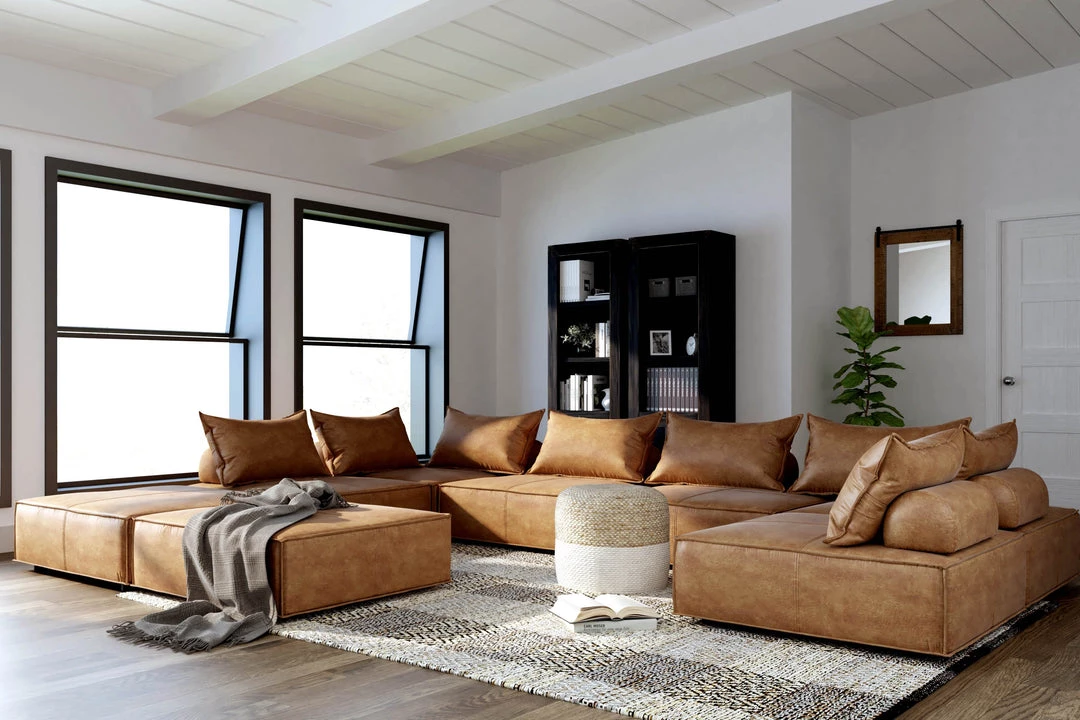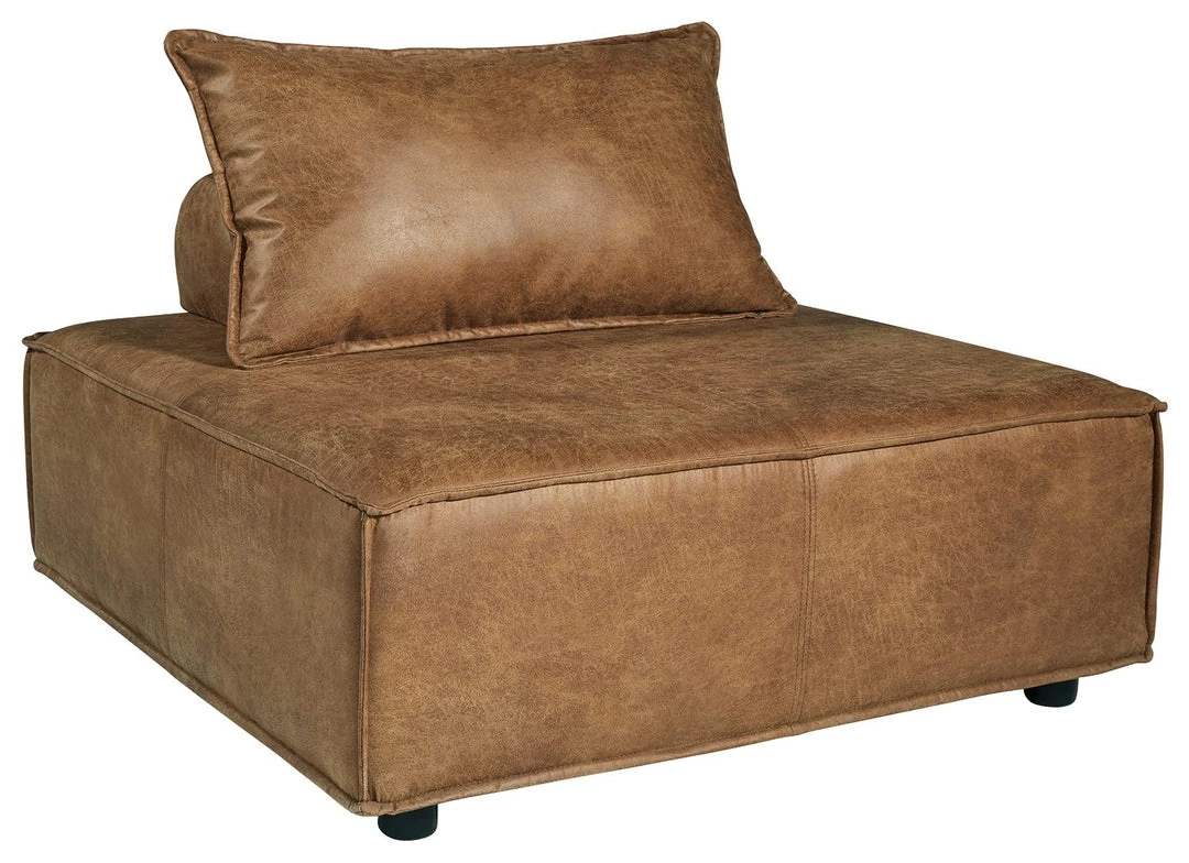 Deep, low seating says relax. Covered in an inviting distressed faux leather with French seams and welted edges, this modular armless floor seat with its clean lines and contemporary styling gives you beauty and comfort that adapts to trends suiting your space for years to come.