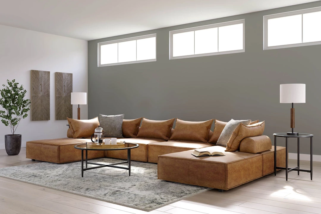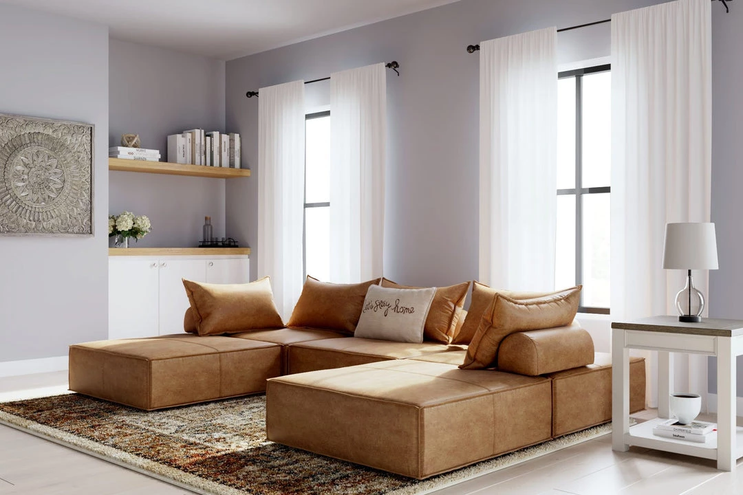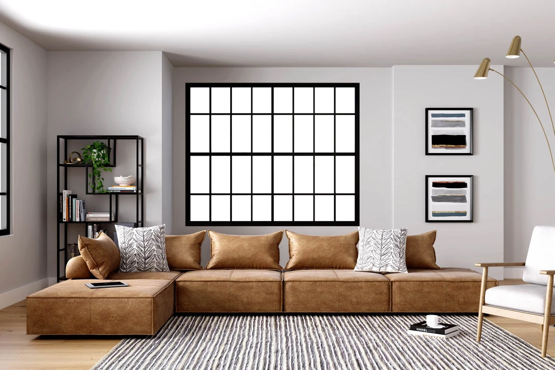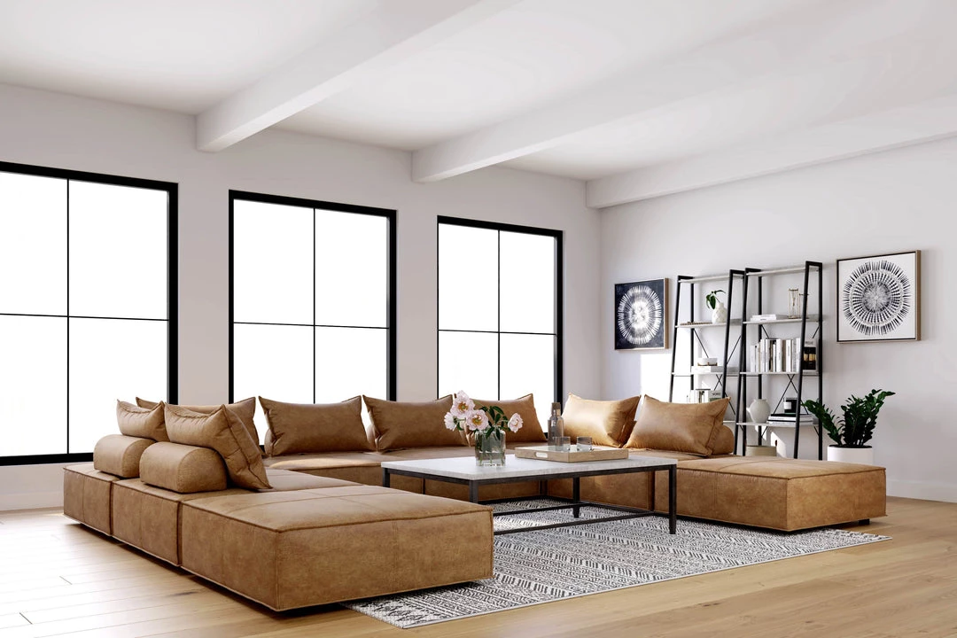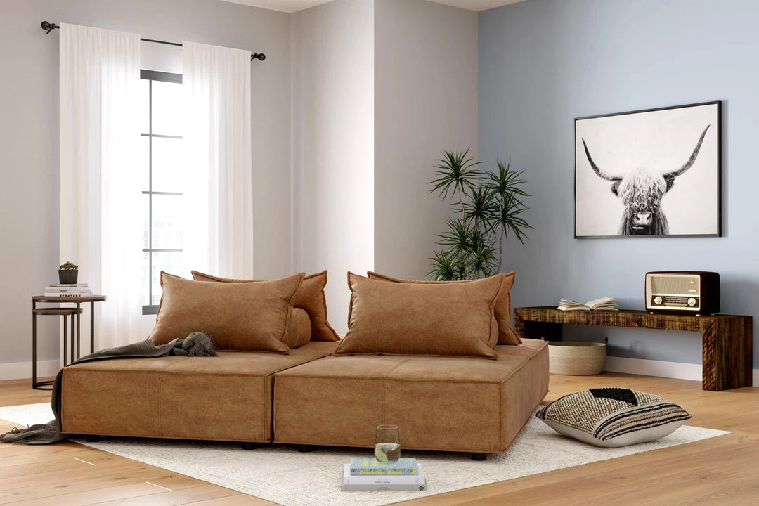 Deep, low seating says relax. Covered in an inviting distressed faux leather with French seams and welted edges, this modular armless floor seat with its clean lines and contemporary styling gives you beauty and comfort that adapts to trends suiting your space for years to come.