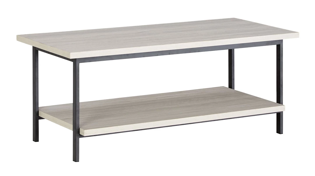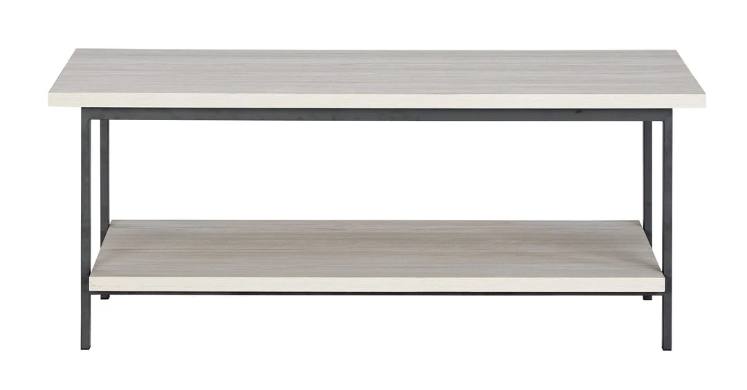 Entertain with ease with this casual, contemporary coffee table. Designed for the modern tastemaker, the minimalist design wows with metal legs and a laminated surface with a whitewashed effect. A lower display shelf provides ample space for books and baskets, or for showcasing your special decor accessories.