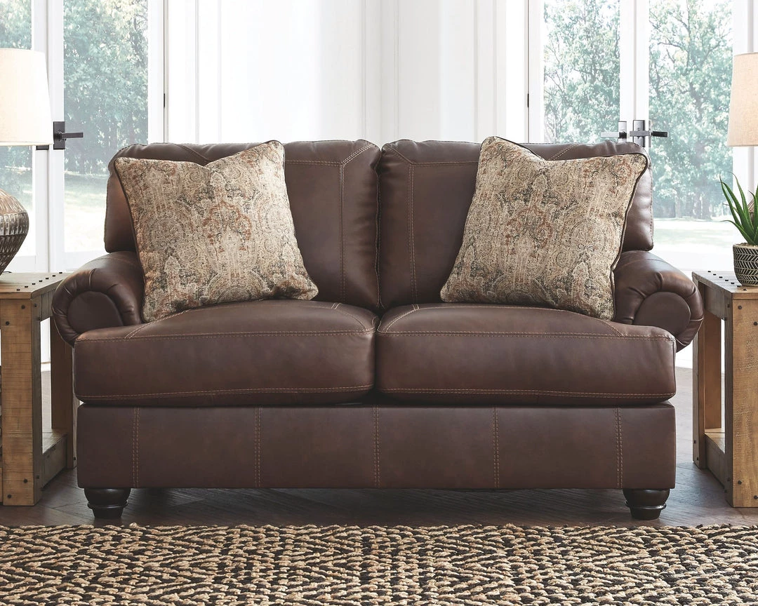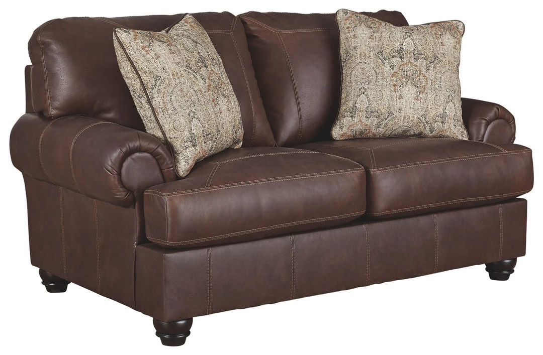 What could be better than the feel of real leather? It’s yours for the taking—at a comfortably affordable price—with this sumptuous loveseat. Rest assured, the seating area and armrests are covered in genuine leather for an incomparable experience. Plush roll arms and distinctive details such as box-stitched cushions and prominent bun feet reflect a sense of richly rustic charm that never goes out of style.