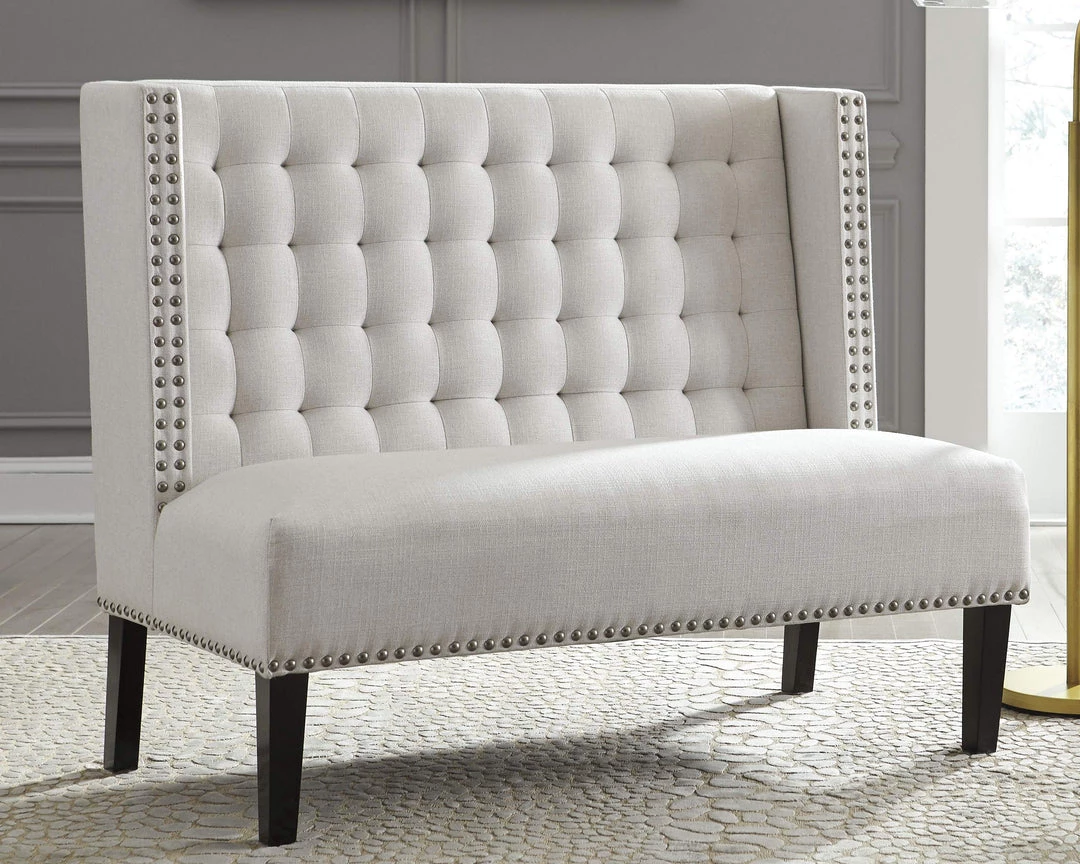 This settee boasts couture-inspired detailing with modern allure. Tufted wingback design is elevated with silvertone nailhead trim. Its luxe appeal with feel-good oatmeal colored fabric puts comfort in style.