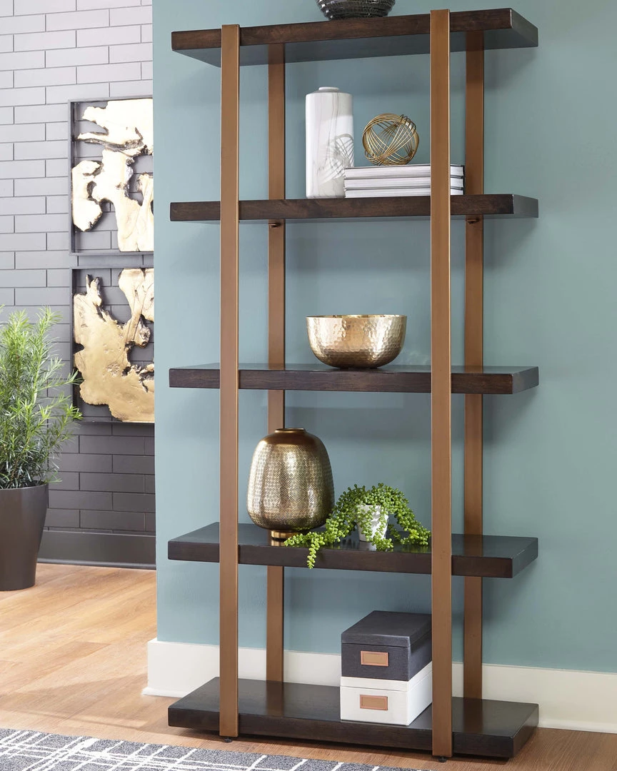 Make a statement with this five shelf bookcase. The dark brown finished wood lends an urban touch, while the antiqued brass-tone finished frame creates a contemporary feel. The layered structure of the bookcase allows ample space for all of your display and storage needs.