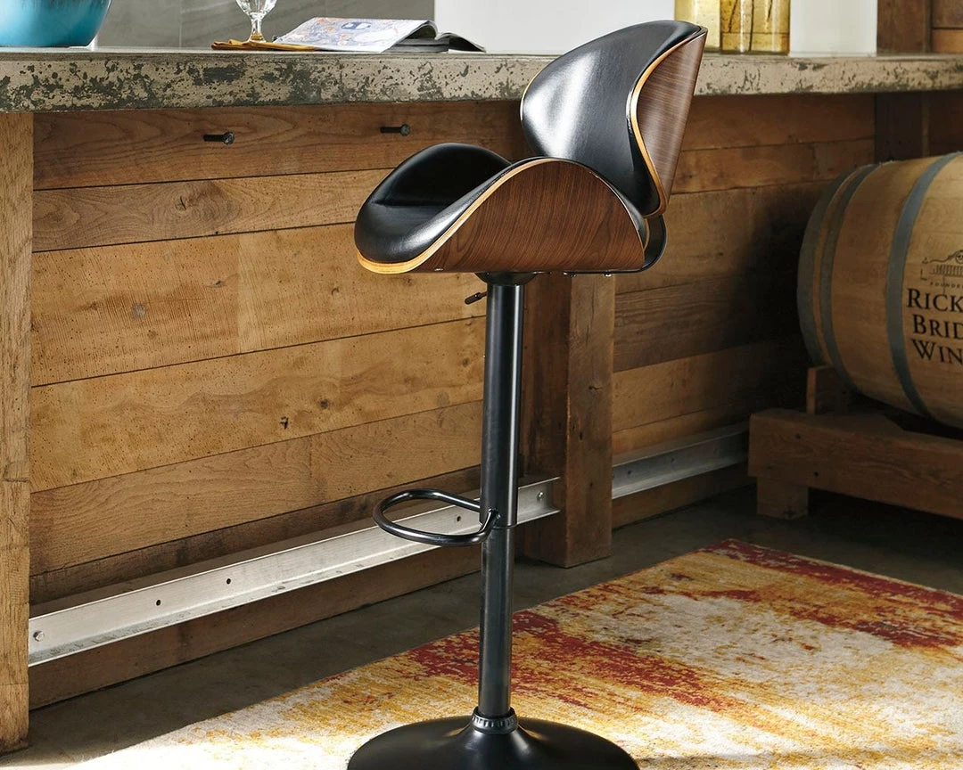 Style takes quite a modern turn. Sporting a distinctively contoured back and seat design, this upholstered swivel bar stool is sure to bring an elevated look to your living space. Wrapped in a black faux leather upholstery, the seating area’s artful contours are accentuated with a faux wood finish.