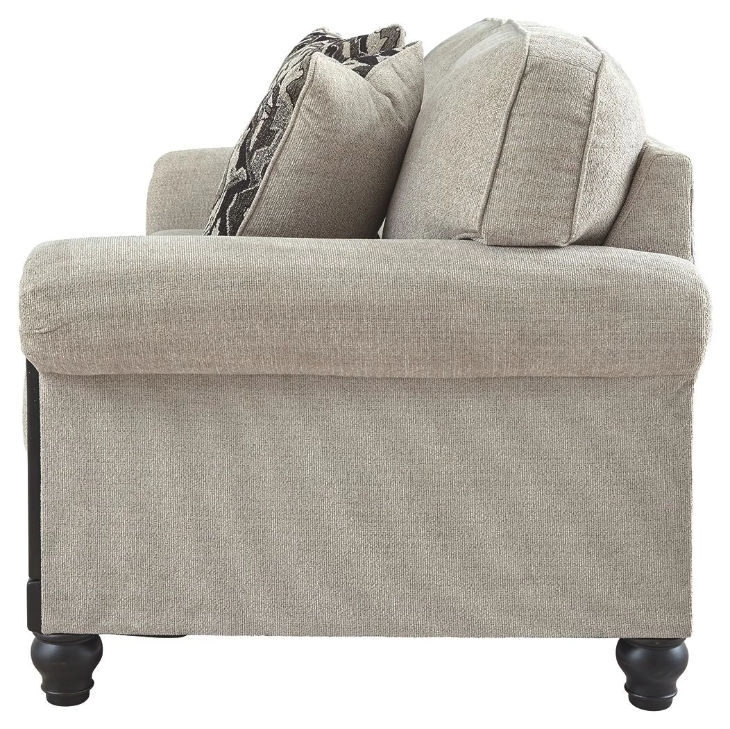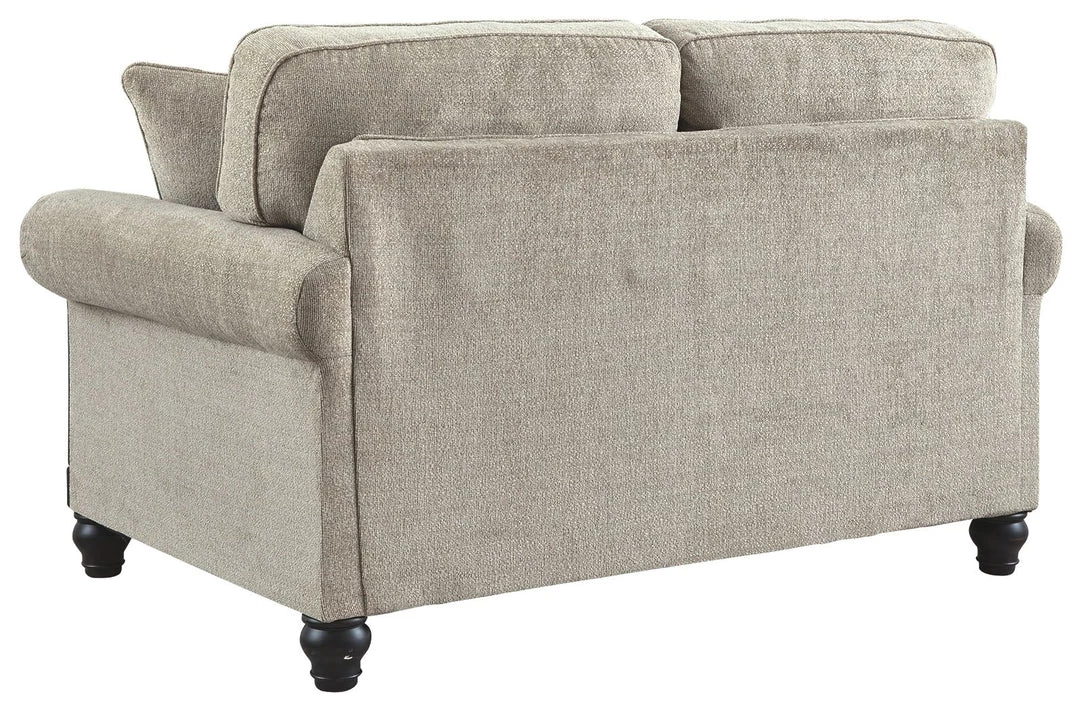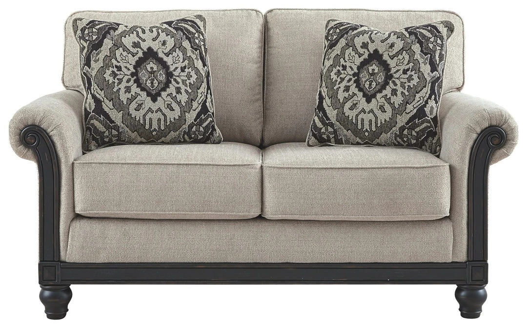 If you’re one to embrace new traditions, behold the beauty of this brilliantly styled loveseat. Giving stately elegance a sense of newfound flair, it’s dressed to impress with a distressed black exposed rail that complements today’s more relaxed lifestyles. Tailored elements like a light and lovely linen-weave upholstery, romantic roll arms and turned bun feet make this updated classic complete.