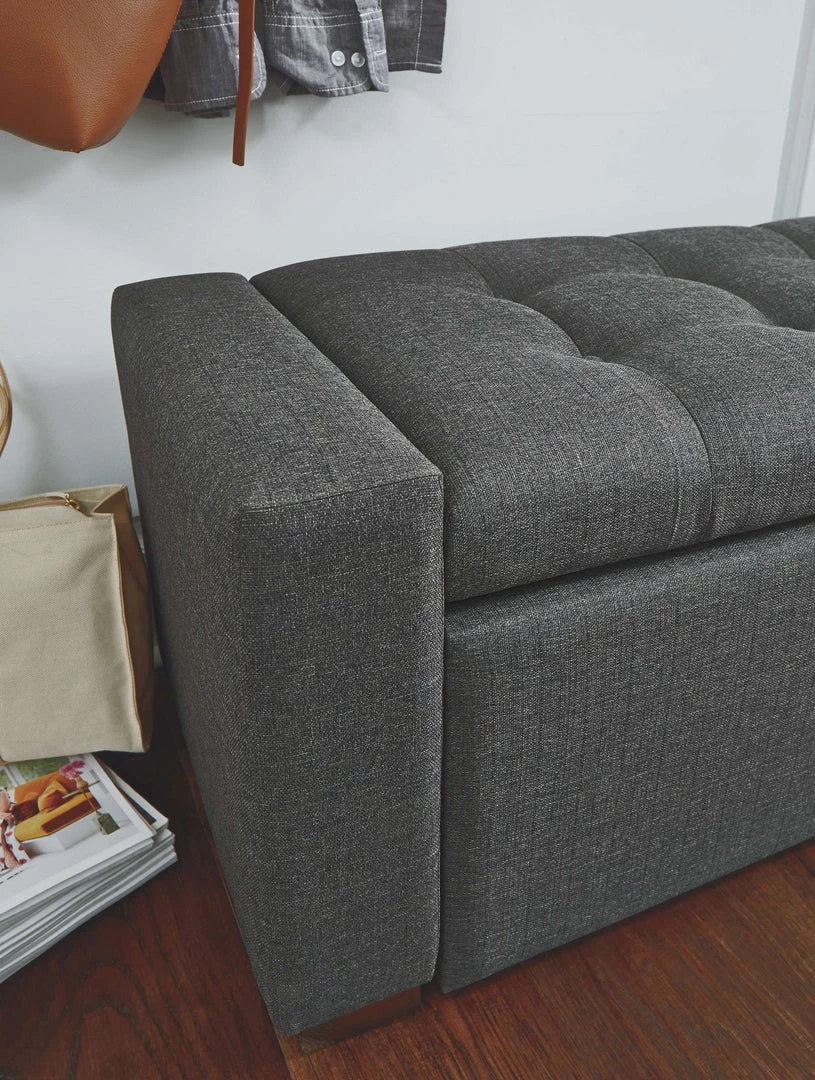Whether gracing a front entry or living room, or placed at the foot of the bed, this upholstered storage bench is loaded with flair. Tufted cushioned seat with hinge reveals an ample storage compartment for this, that and the other. Gorgeous gray fabric is the epitome of neutral sophistication.