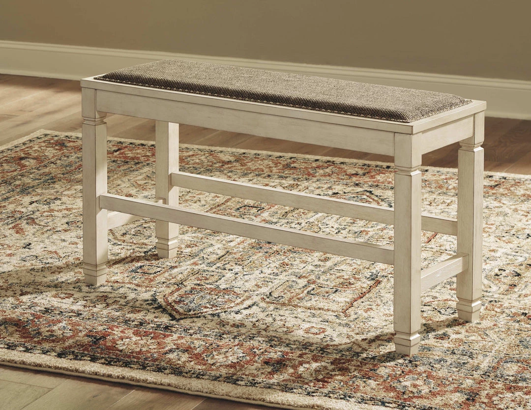 The beauty of this upholstered dining bench is something to savor. Serving up comfort and flair, this generously scaled counter-height bench entices with a cushioned seat covered in a heavy woven fabric that complements the antiqued white finish.