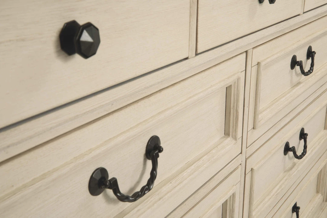 Made with select hardwood solids, Acacia and White Oak veneers with engineered wood. Finished in a trendy textured antique white and contrasting weathered gray color. Dovetailed drawers feature fully finished drawer boxes and metal ball bearing side glides. B647-57 and -58 shelter styled panel headboard has lattice design headboard panel. B647-77 and -78 shelter styled panel bed features a louvered headboard panel. Cases feature framed drawer fronts, break-front pilasters and profiled base mouldings for added dimension. Metal hardware is finished in a black iron color. An accent night table features door cabinet storage with an AC power supply and USB charging ports for powered devices.