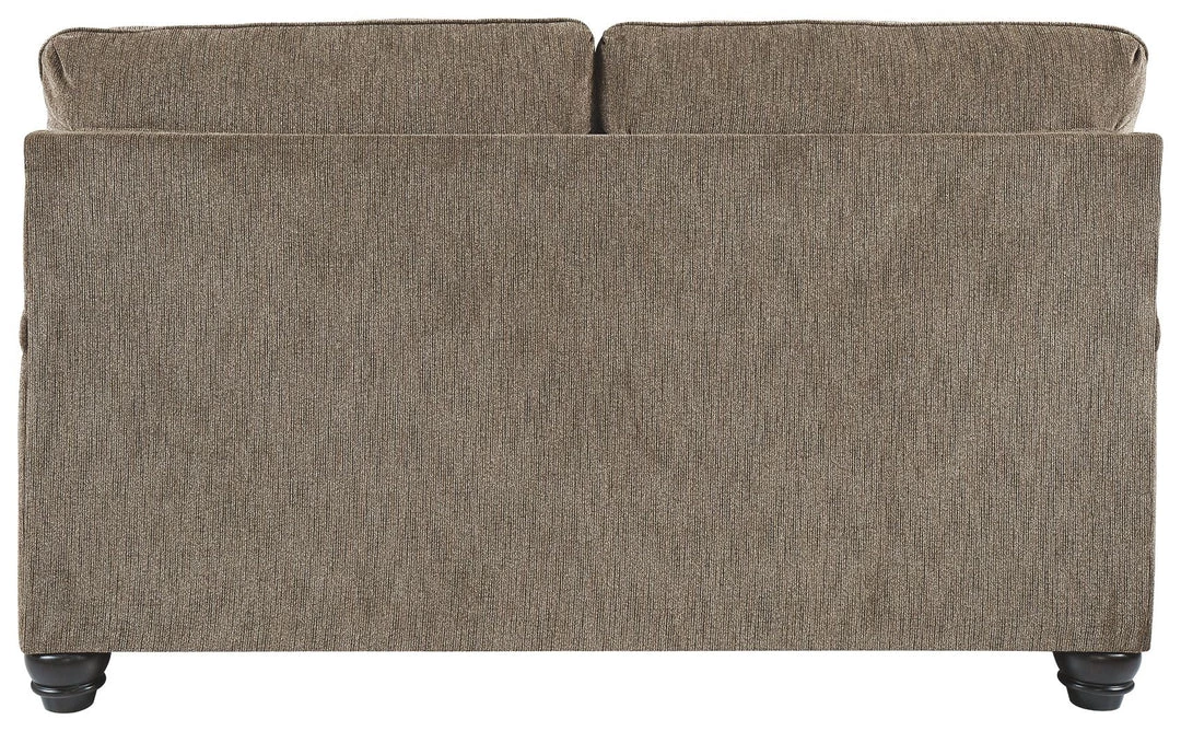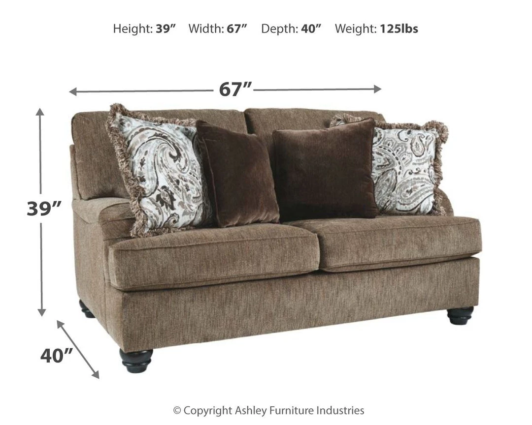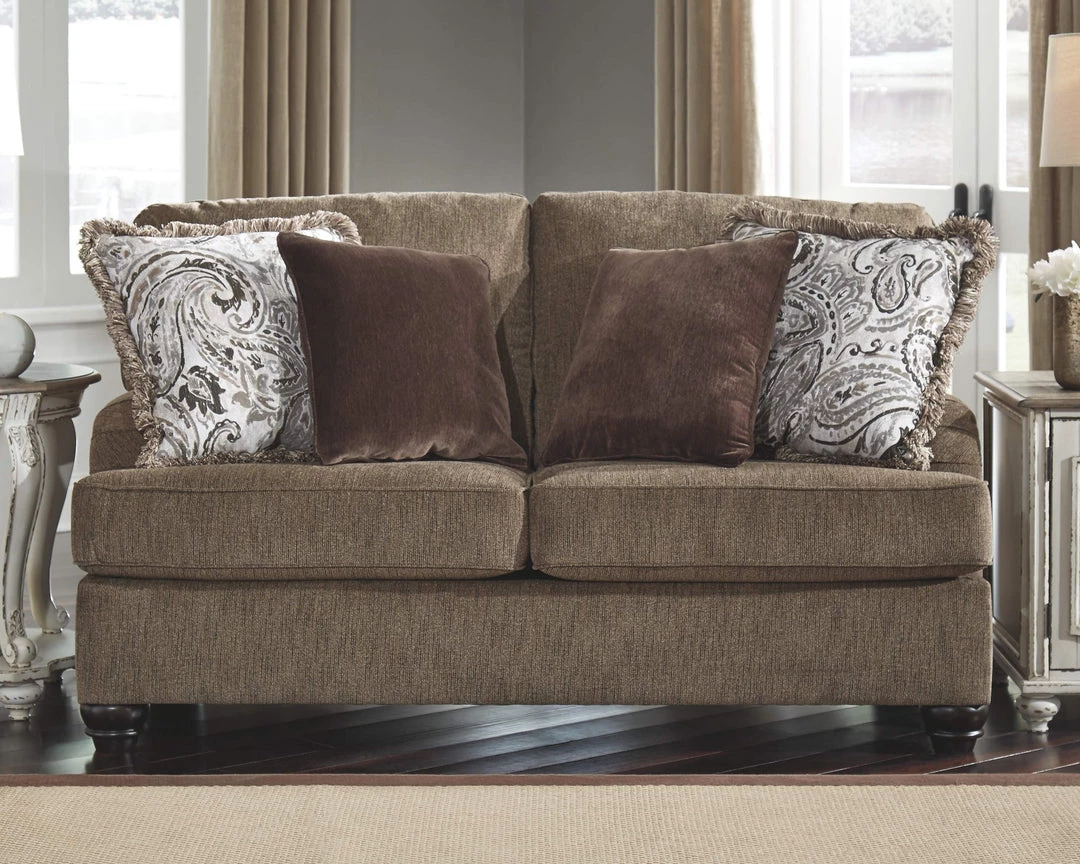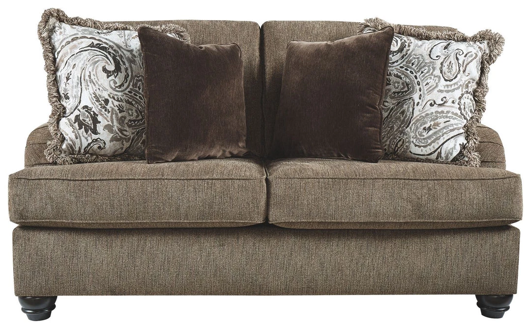 Tell your interior style story with this sophisticated loveseat. Traditional Charles of London arms and turned feet are charming touches. Speaking of touch, this loveseat is teeming with texture. From the light brown cushions to the fringe-bordered and chocolatey velvet pillows, you’ll revel in its softness. Impressive comfort of the deep, plush cushions is sure to bring you joy.