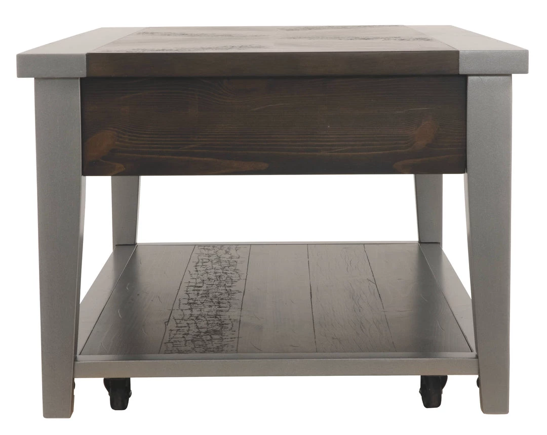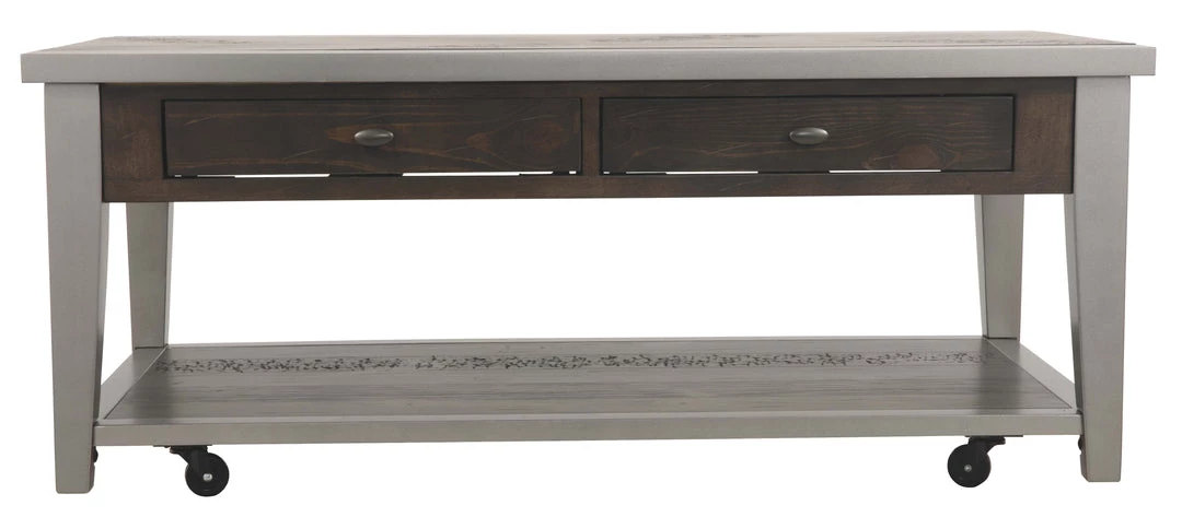 Simply striking yet remarkably detailed. That’s the beauty of this rectangular coffee table. Its clean-lined profile is greatly enhanced by a dramatic tabletop with butterfly veneer layup. And the finish? So complex in a rustic gray tone with hints of aged metallic. Unique oval shaped hardware on the double drawers rounds out the look.