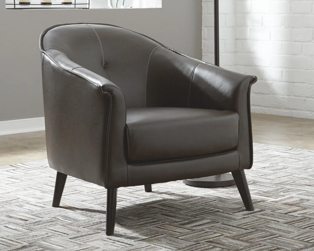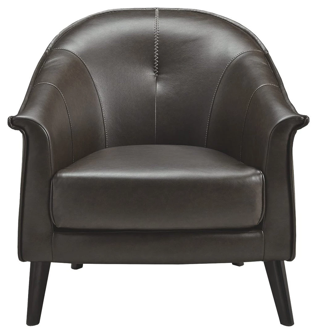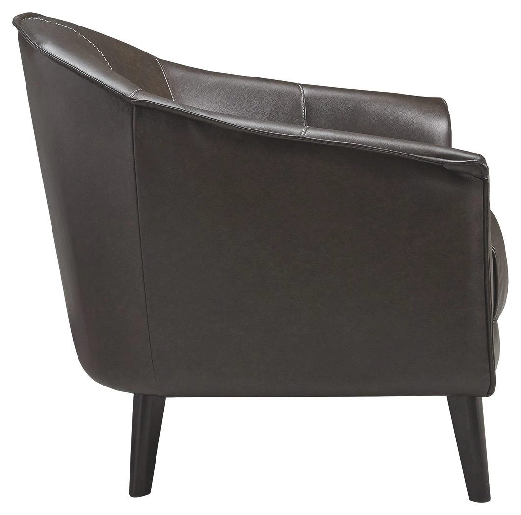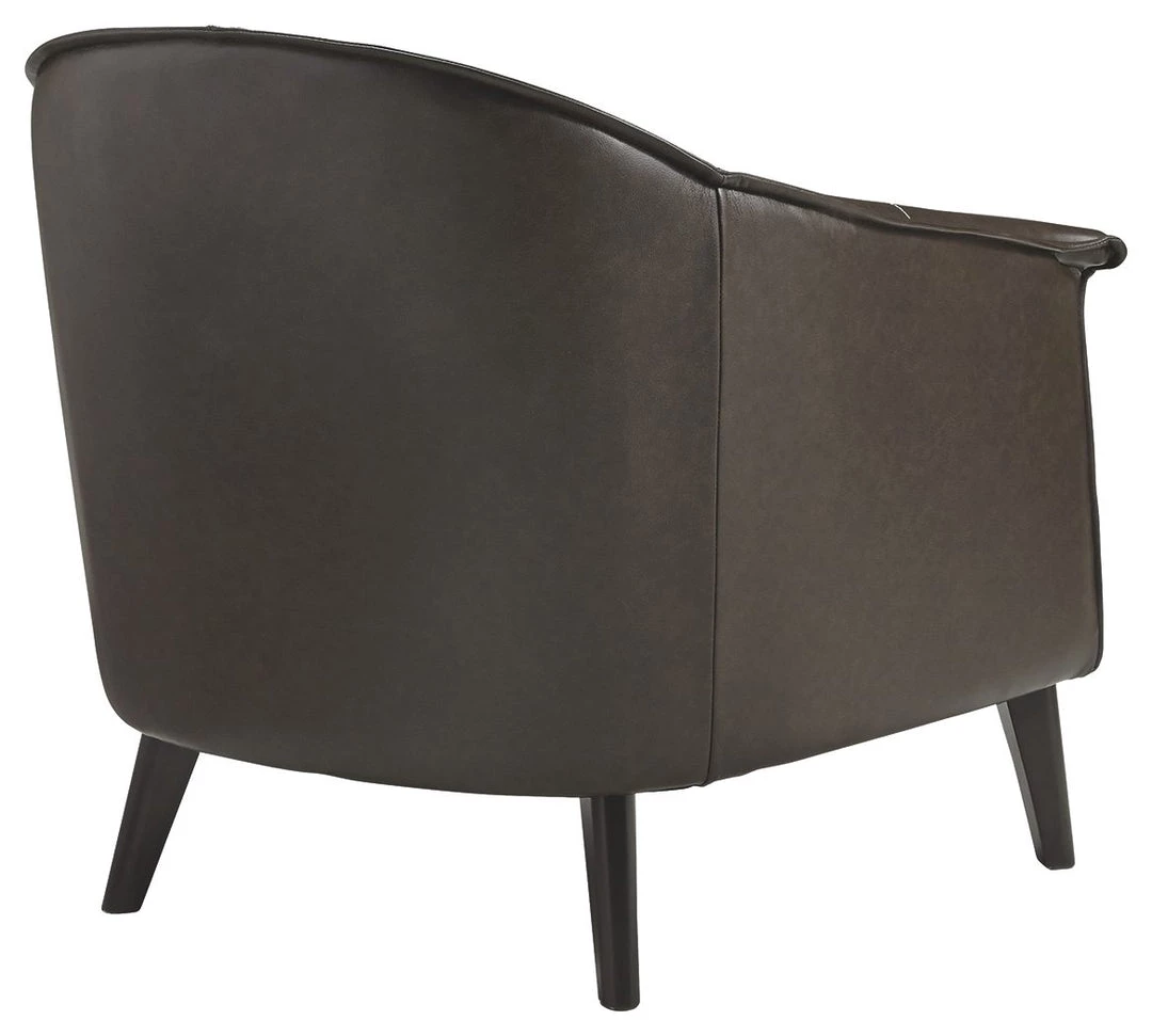 Traditional collides with contemporary in this accent chair. Flare arms, contrast stitching and tapered wood legs add a certain modernity to a classic club chair silhouette in dark brown faux leather upholstery.