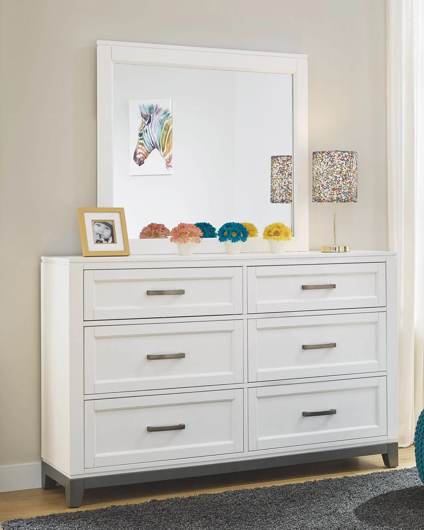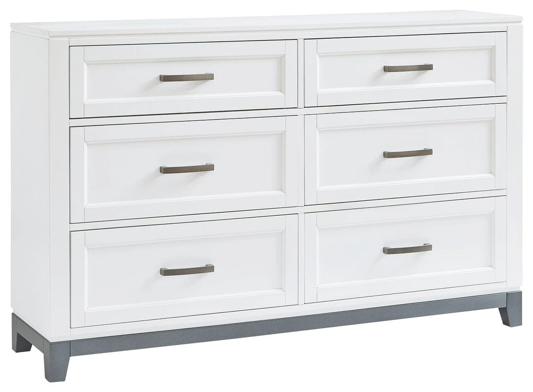 Casual design with timeless Shaker styling. Cases feature picture framed drawer fronts and floating top design. Made with solid wood components and engineered wood. Painted white finish with contrasting raw steel colored bases. Drawer feature dovetailed construction with metal center guides. Metal bar pulls with a satin nickel colored finish. Paneled headboard design with picture framed details and low profile storage footboard. Roll slats included.