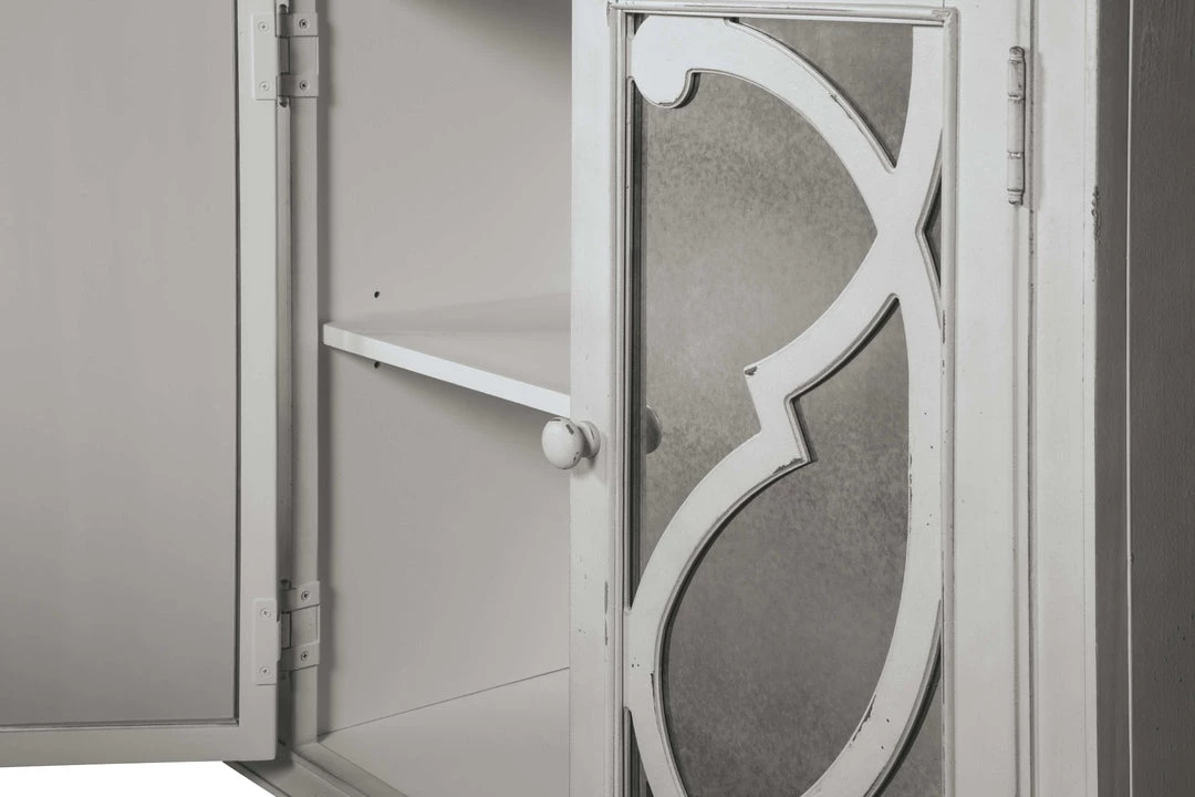 Put your love of shabby chic style on display with this wonderfully versatile cabinet. Adding to the charm of its distressed vintage paint finish: mirrored doors with scrolled framing for a romantic twist. Adjustable shelf and ample storage space make it abundantly practical.