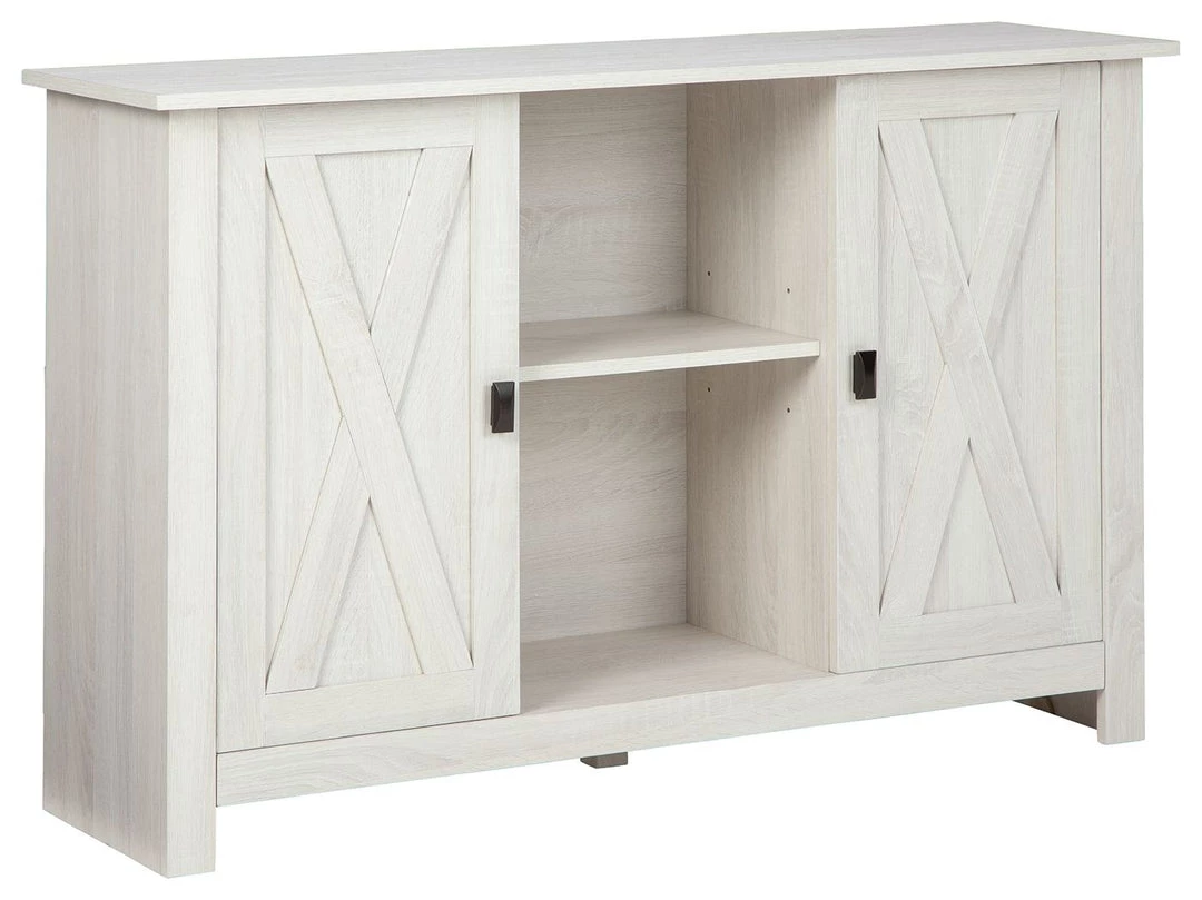 Casual and vintage style meet to make this accent cabinet. Two open storage cubbies allow you to feature decorative pieces or photographs and additional concealed space behind two doors provides an excellent storage solution. The crossbuck pattern door front adds a vintage feel, while the antiqued white wood laminate makes this a versatile addition to your space.