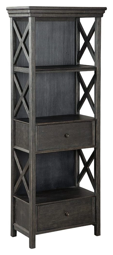 Unique two-tone finish with a combination of Oak and Acacia substrates combining a trendy textured antique black color with table and server tops finished in a textural weathered oak finish. Rectangular dining table features six convenient drawers for storing smaller items. The -02 upholstered host chair inspired by the trendy deconstructed styles for casual living. The -01 side chairs feature a boxed cushioned seat. All chairs feature a heavy woven grayish brown fabric for added textural qualities. The large capacity server has three doors with lattice design. The tall bunching unit has two drawers, three shelves and open lattice sides.