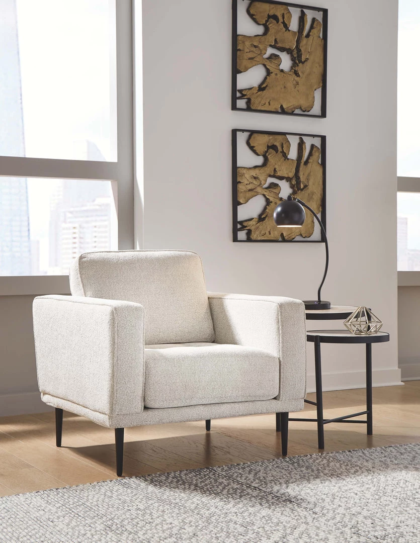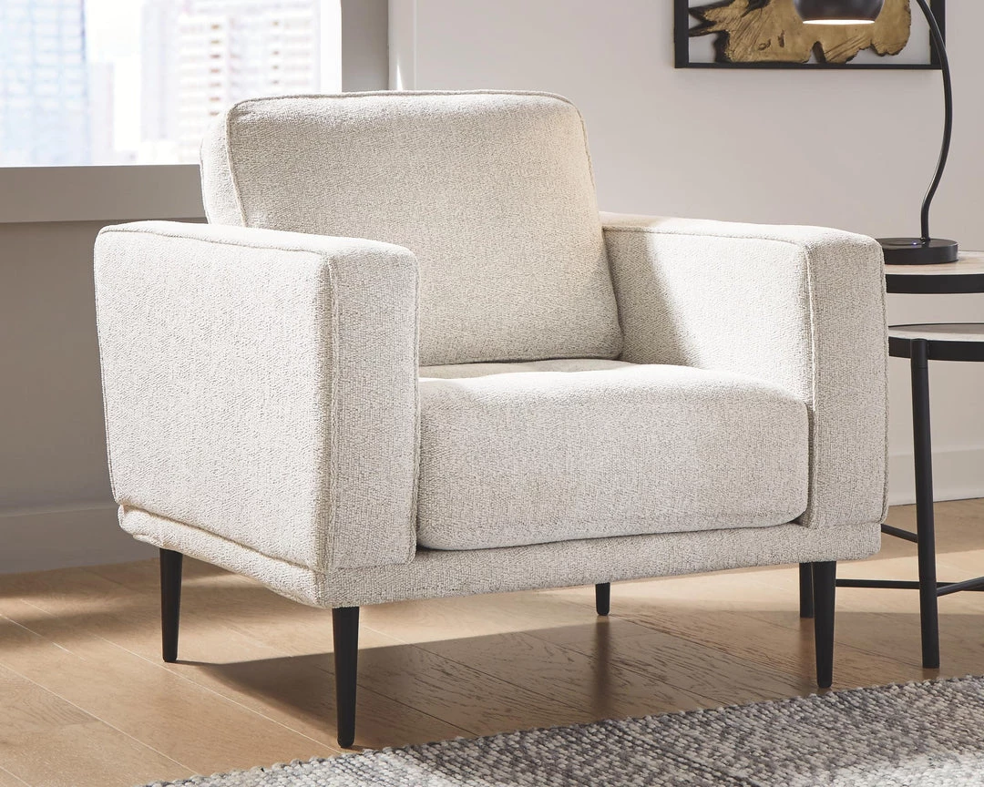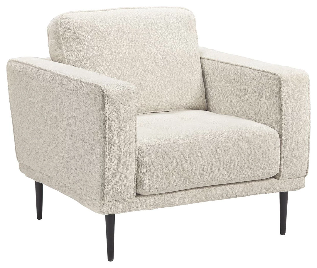 This arm chair combines the clean lines of mid-century style with the cozy softness of your favorite blanket to create your favorite piece of furniture. The textured chenille upholstery evokes a feeling of comfort and security while the faint chevron pattern and exposed black metal legs add sophistication.