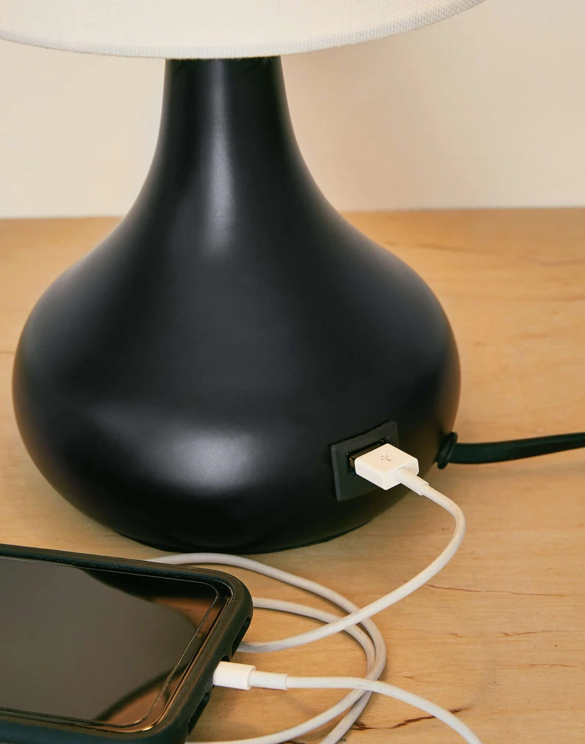 With its sleek metal droplet body, topped with a white drum shade, this table lamp creates an engaging look. A single USB charging port keeps your electronics up and running at all times. Place this lamp in the living room for a radiant focal point that speaks to the educated eye, or use it in the boudoir for an opulent touch.